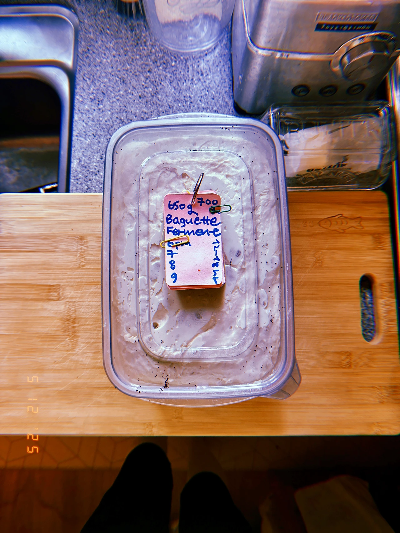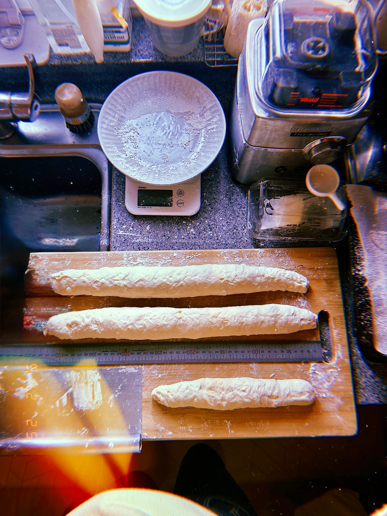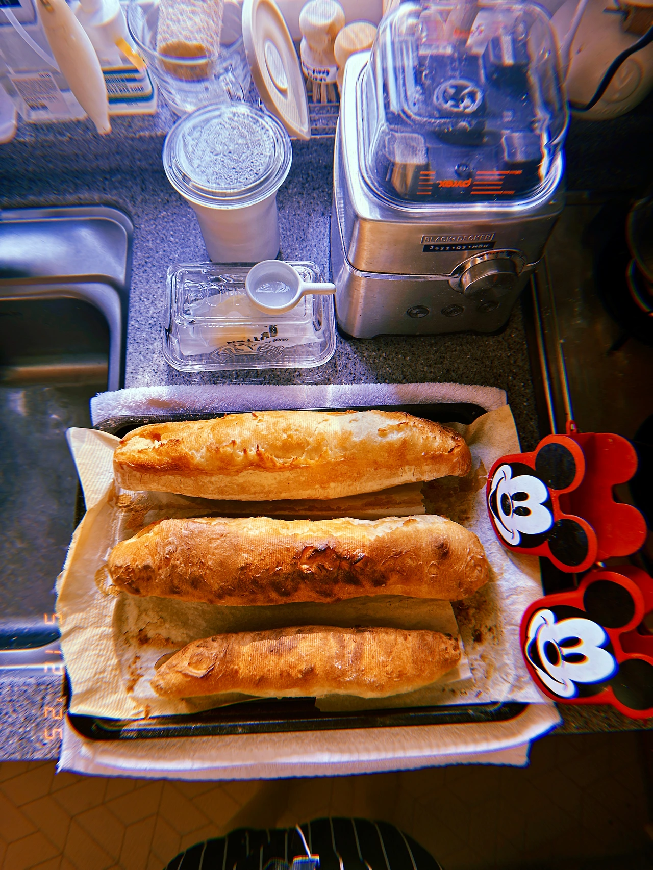 오늘은 통에서 빠져나온 반죽 그대로 3 등분해서 접기도 생략하고 바로 꼬집고 칼집도 생략. 역대로 긴 43cm 나왔다. 그러나 매우 통통하고 탐스러운 브라운 나왔고 선물 받은 <레몬 올리브 오일+버터 반토박>에 잭이 눌러준 에스프레소 for bf. #Sunny-1 #F5Dec2025