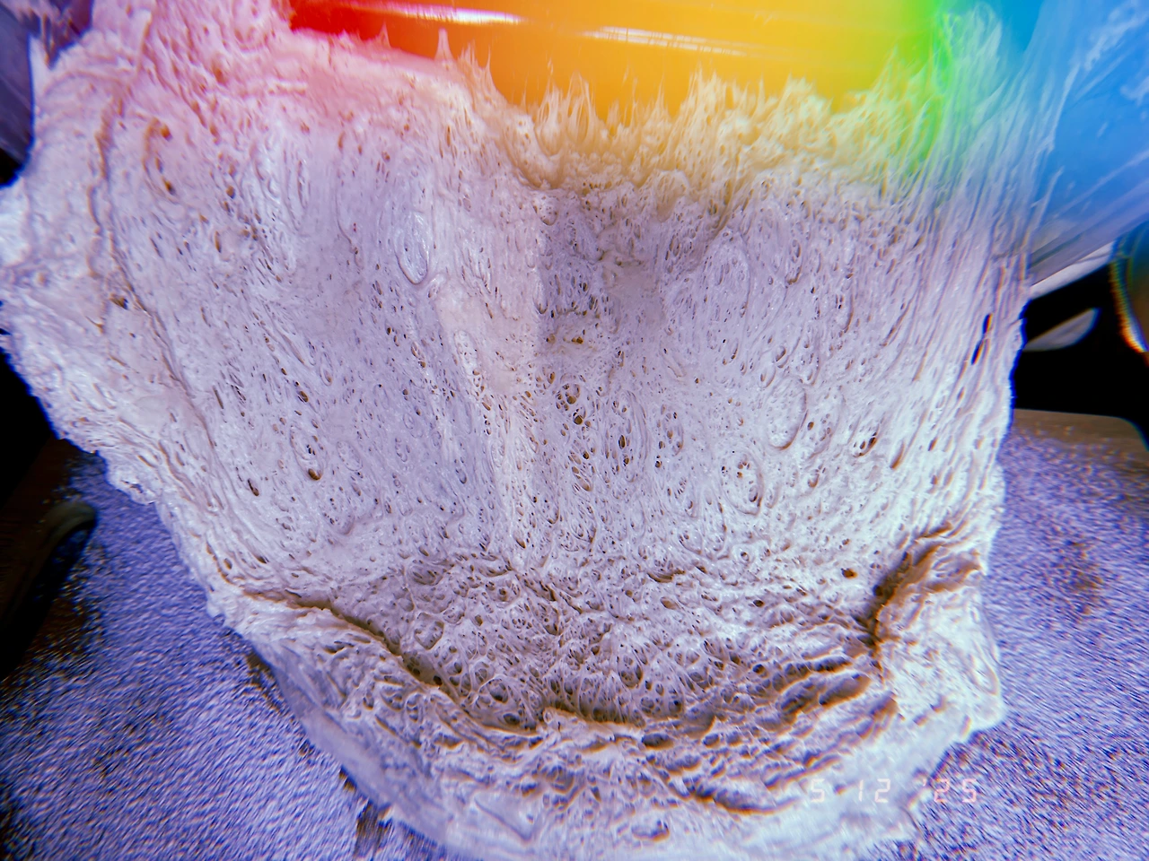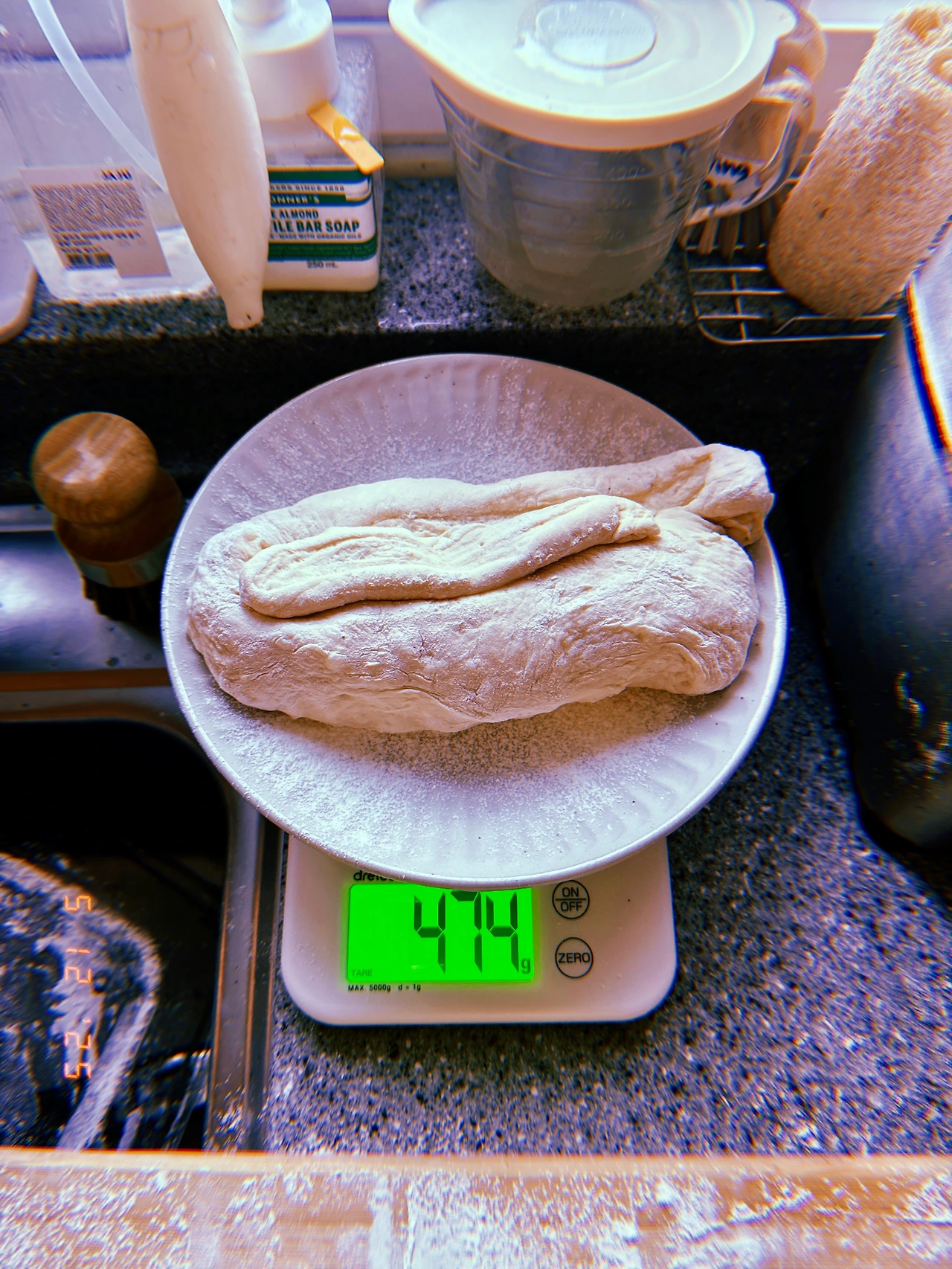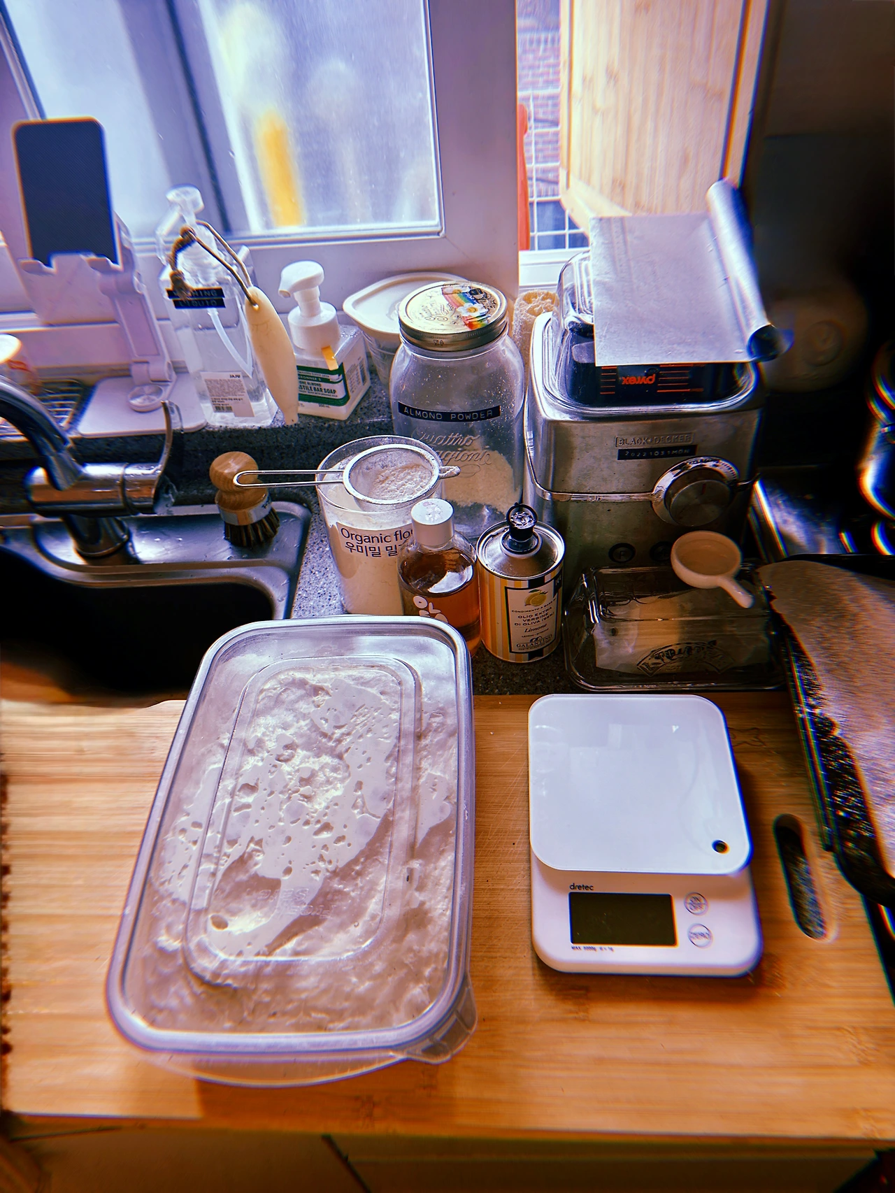 오늘은 통에서 빠져나온 반죽 그대로 3 등분해서 접기도 생략하고 바로 꼬집고 칼집도 생략. 역대로 긴 43cm 나왔다. 그러나 매우 통통하고 탐스러운 브라운 나왔고 선물 받은 <레몬 올리브 오일+버터 반토박>에 잭이 눌러준 에스프레소 for bf. #Sunny-1 #F5Dec2025