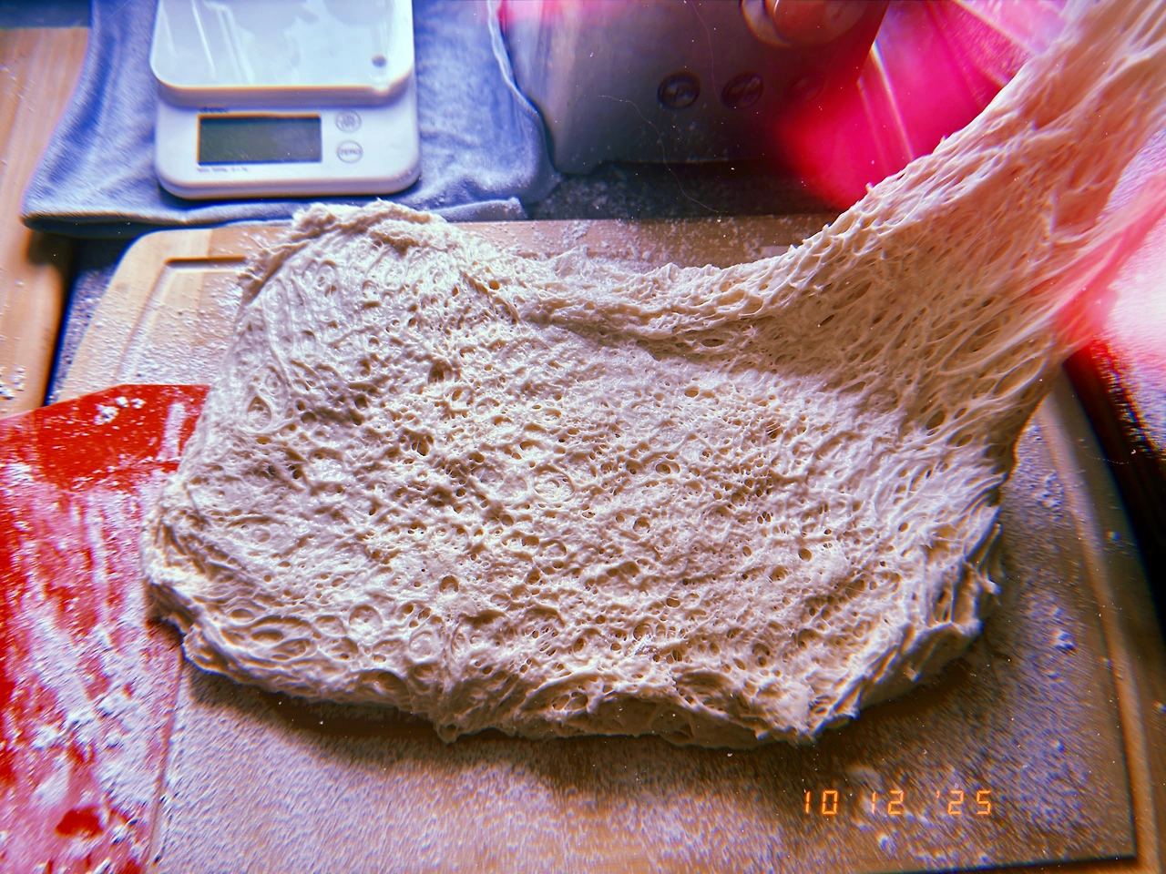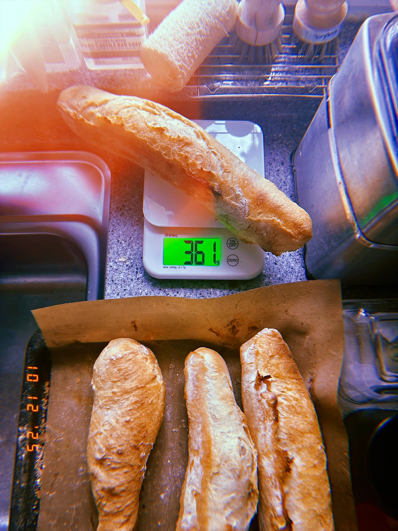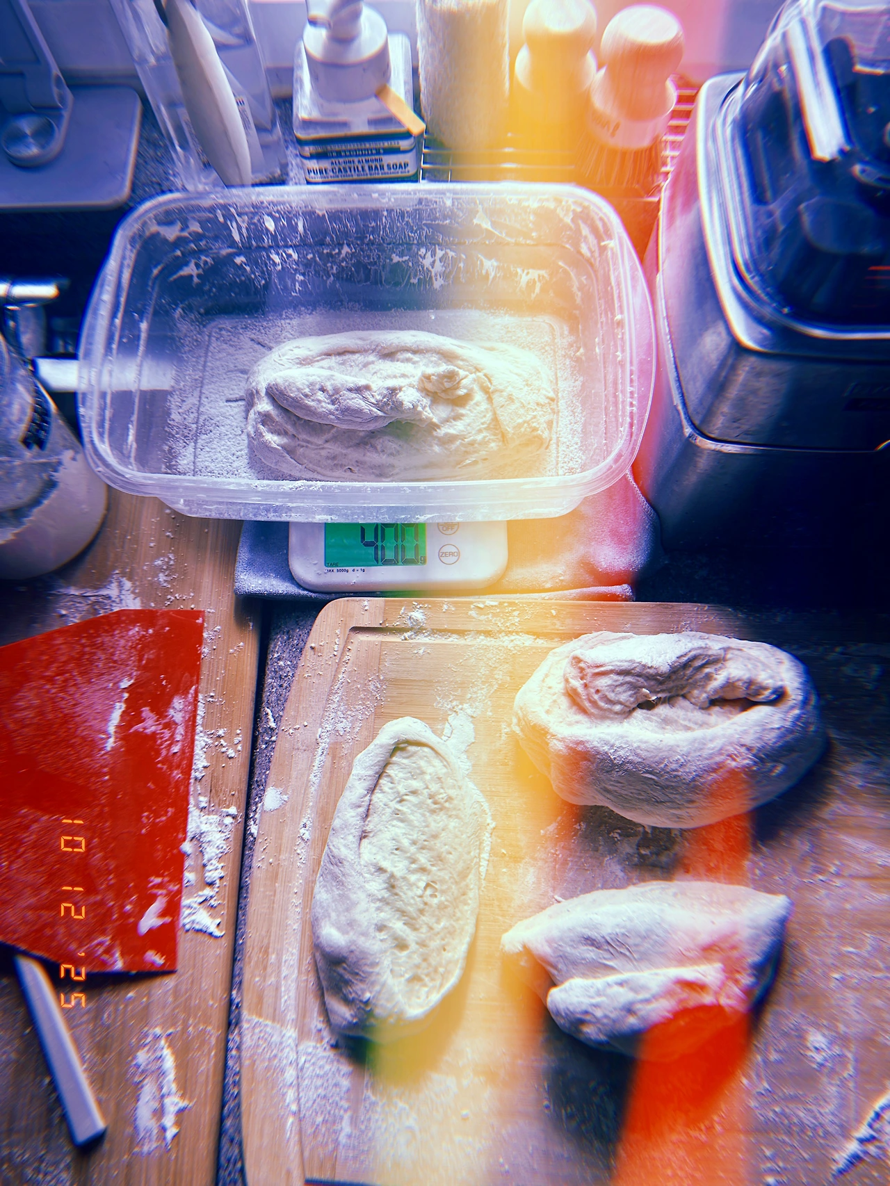 709g (T55+강력분) 발효가 너무 잘되어 뚜껑이 활짝 열려서 모서리 부분이 딱딱해졌다. 반죽 3 등분한 다음 똑-같이 400g으로 구웠는데 어떤 애는 64g 줄고 어떤 애는 50g 보다 더 가벼워졌다. 접기+성형 거의 안 해서 그럴지도. Anyhow.