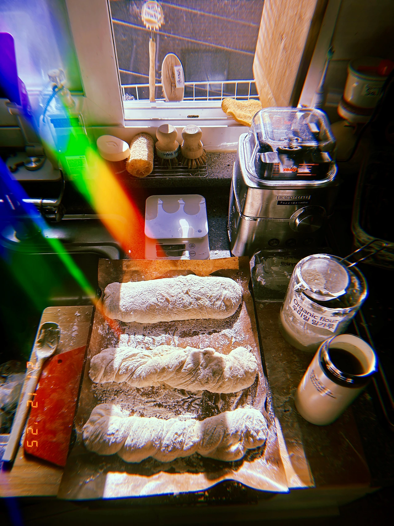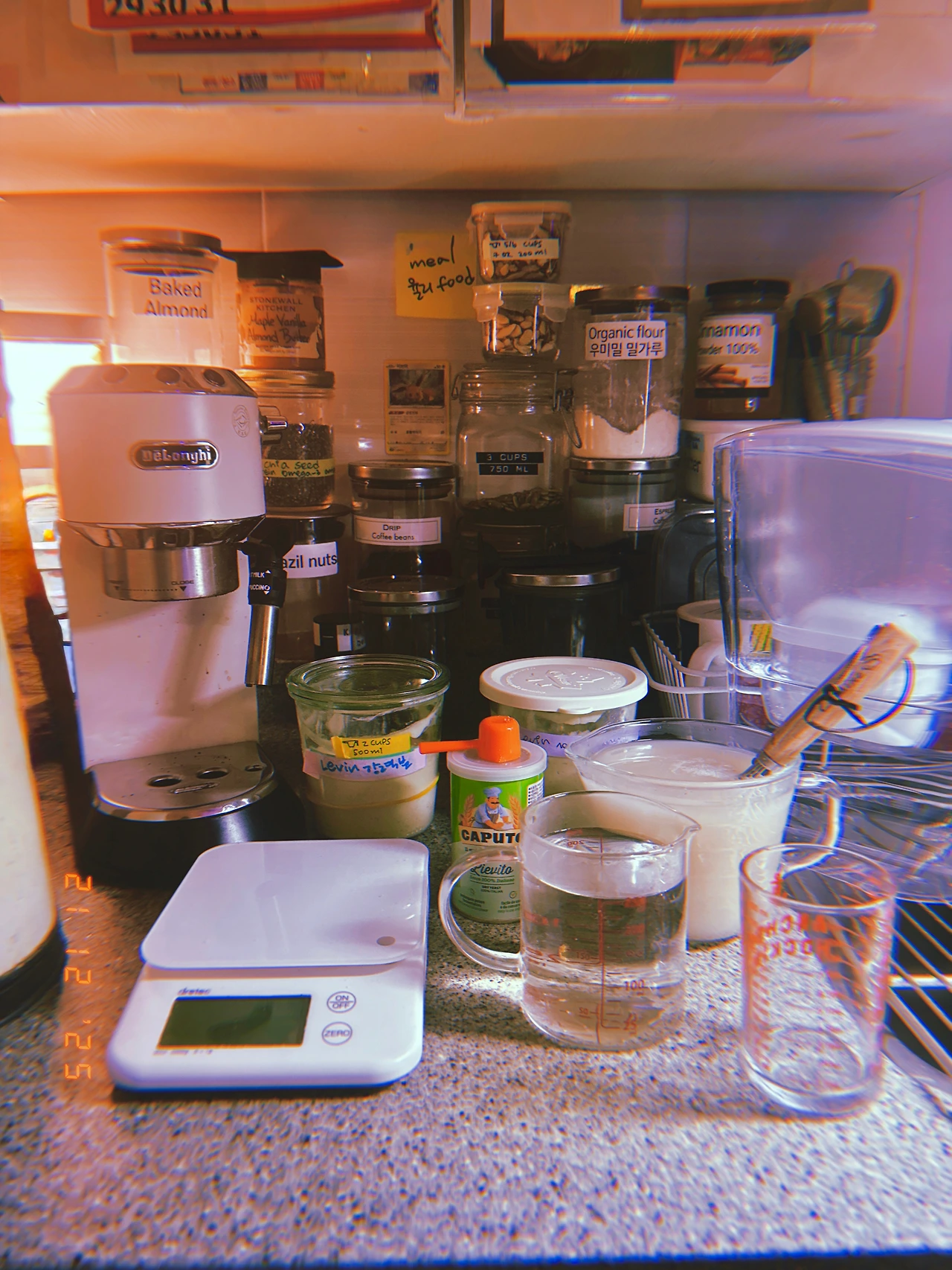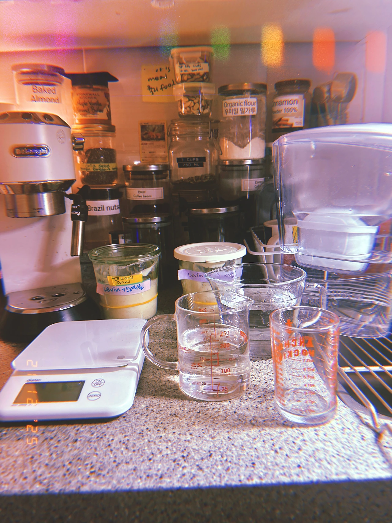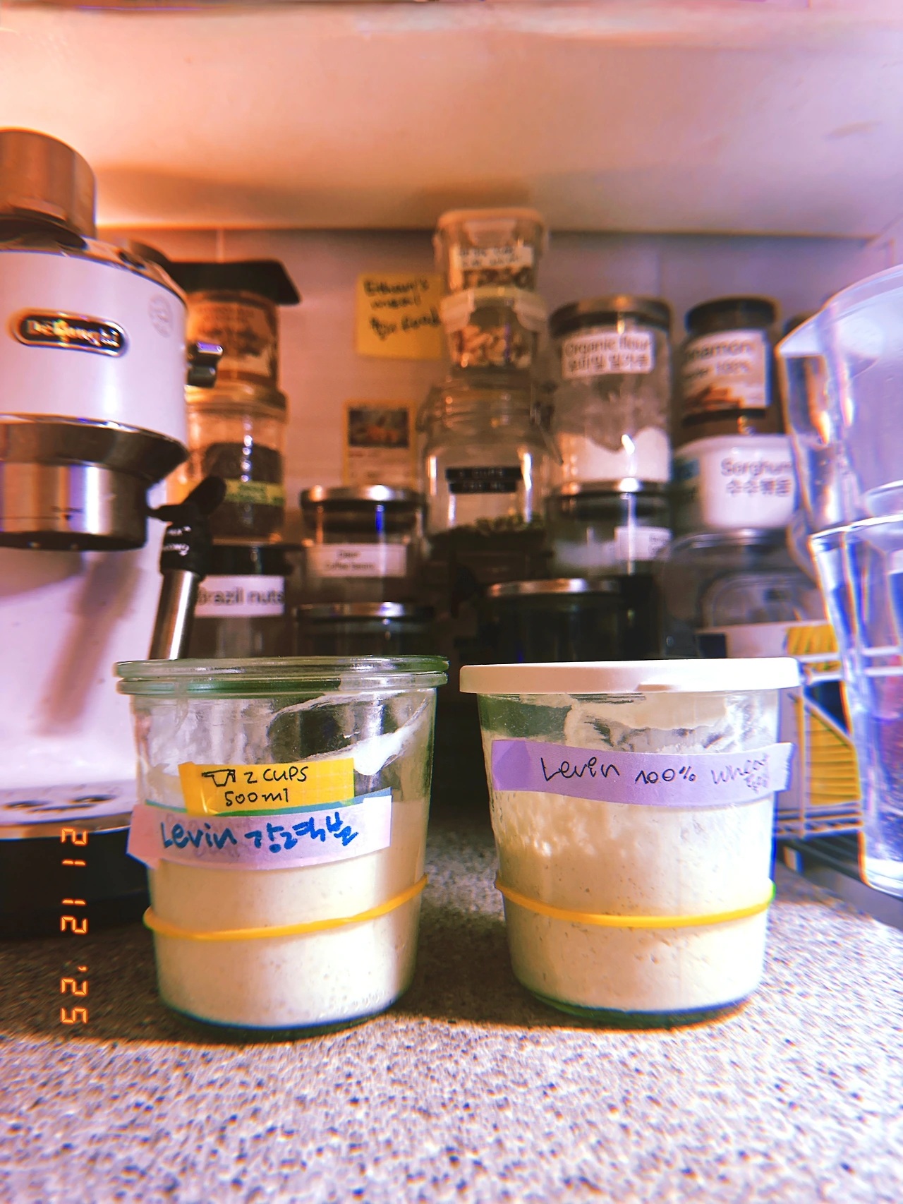 #evening 르방, 반씩 버려가며 만들어야 하는데 버리지 아니하고 계속 밥 주는 중. 혹시 넘쳐 흐를 거 대비해서 위로 쌓지 않고 나란히 두었다. 내일 바게트 반죽 (프랑스 T55+박력분) 진-반죽 또 도전. 맛의 노예가 되고 있다.-o- #dark-2 #Sn21Dec2025