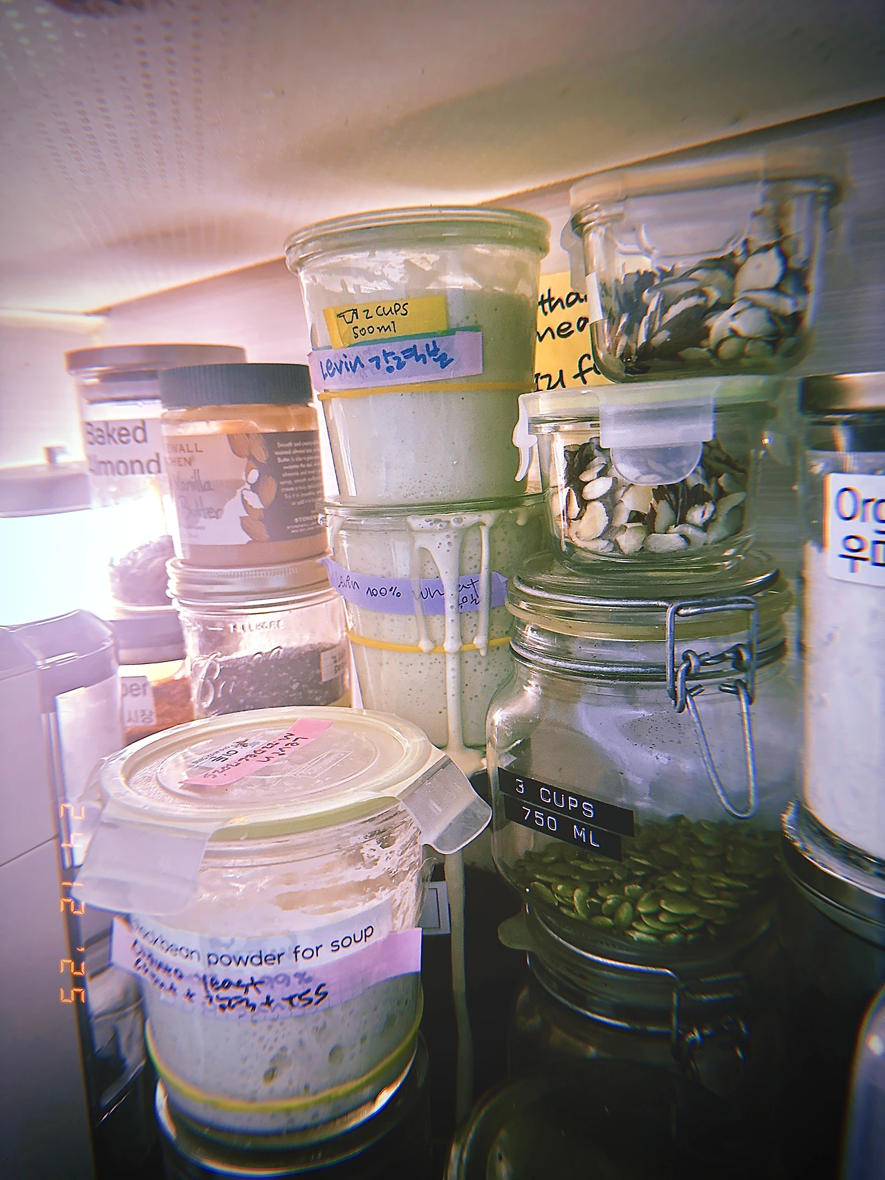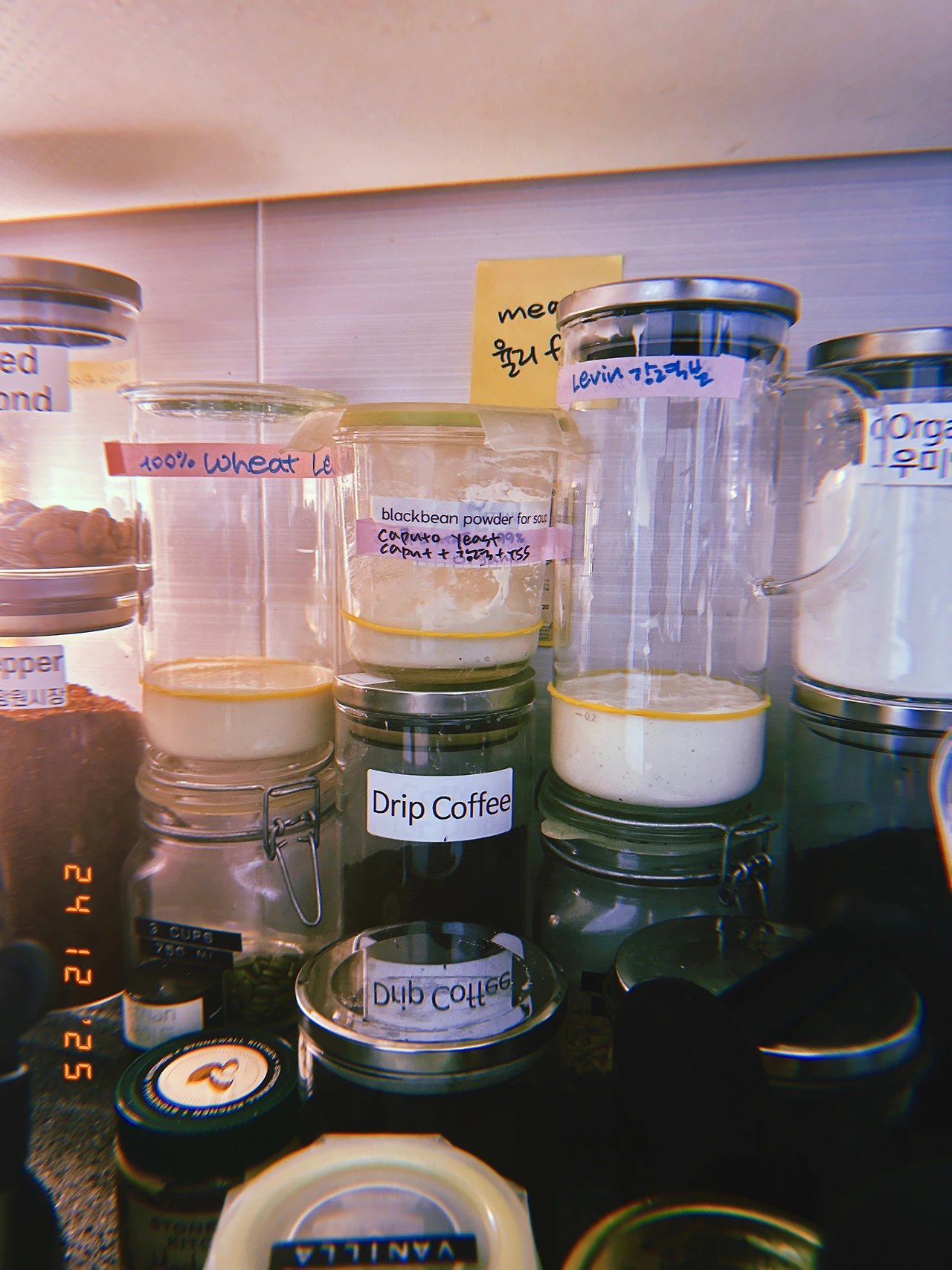 으악 깜짝이야@@‘ 4pm 간식 <쿠키> 먹고서 혹시 우리 르방들 잘 크고 있나 ~ 보자마자 경악했다’’ 가장 잘 자란다는 <통밀 100%>르방만 며칠째 꿈쩍하지 않아서 ‘믿을 게 못되네’ 하던 차였는데, 통밀 르방만 넘쳐흘러 흘러~ 바닥으로 내려간 거다. ouch’’
