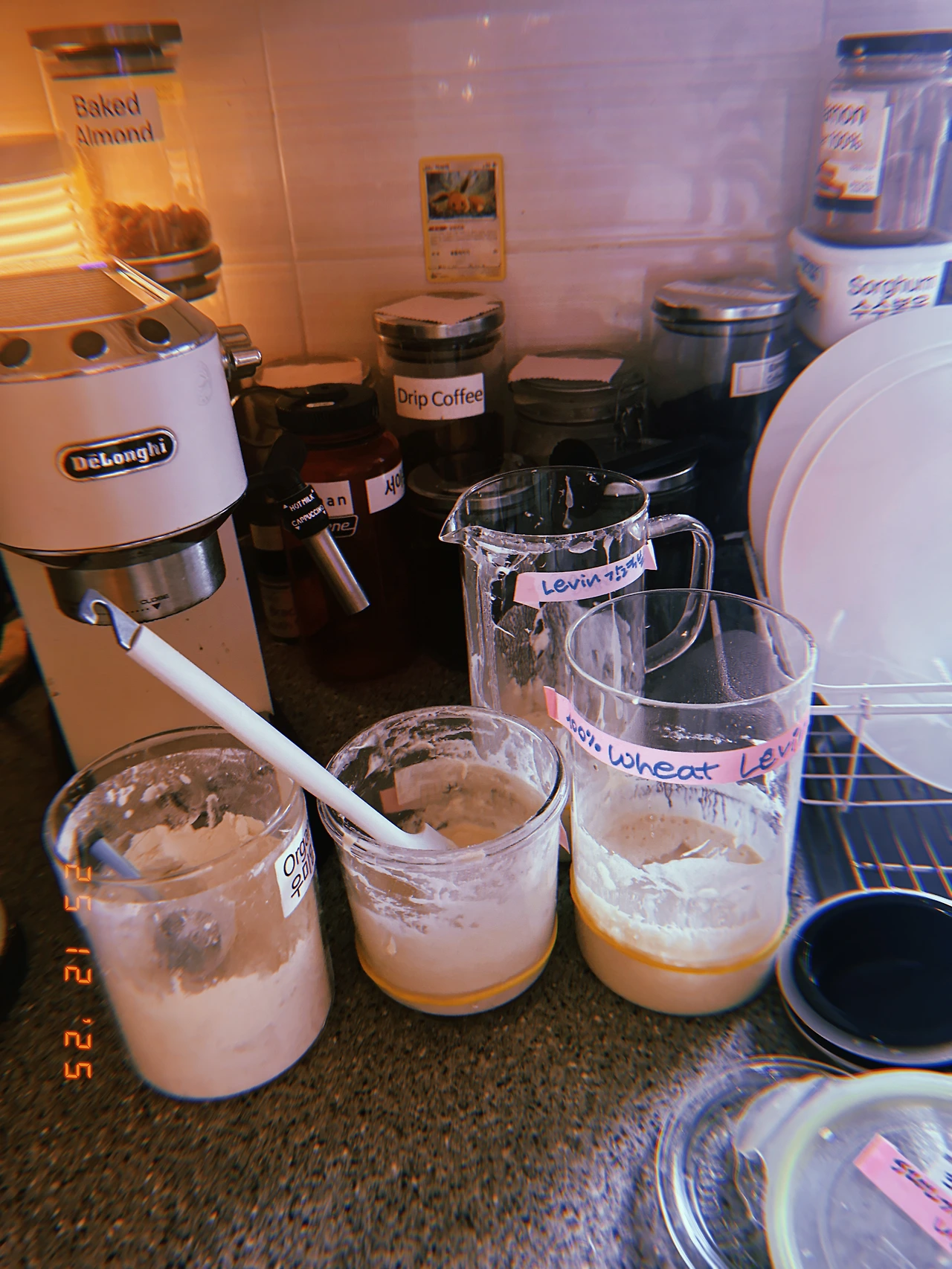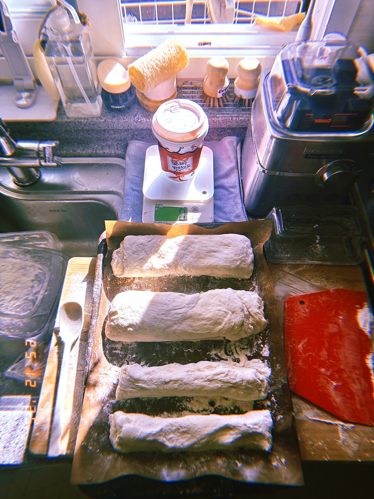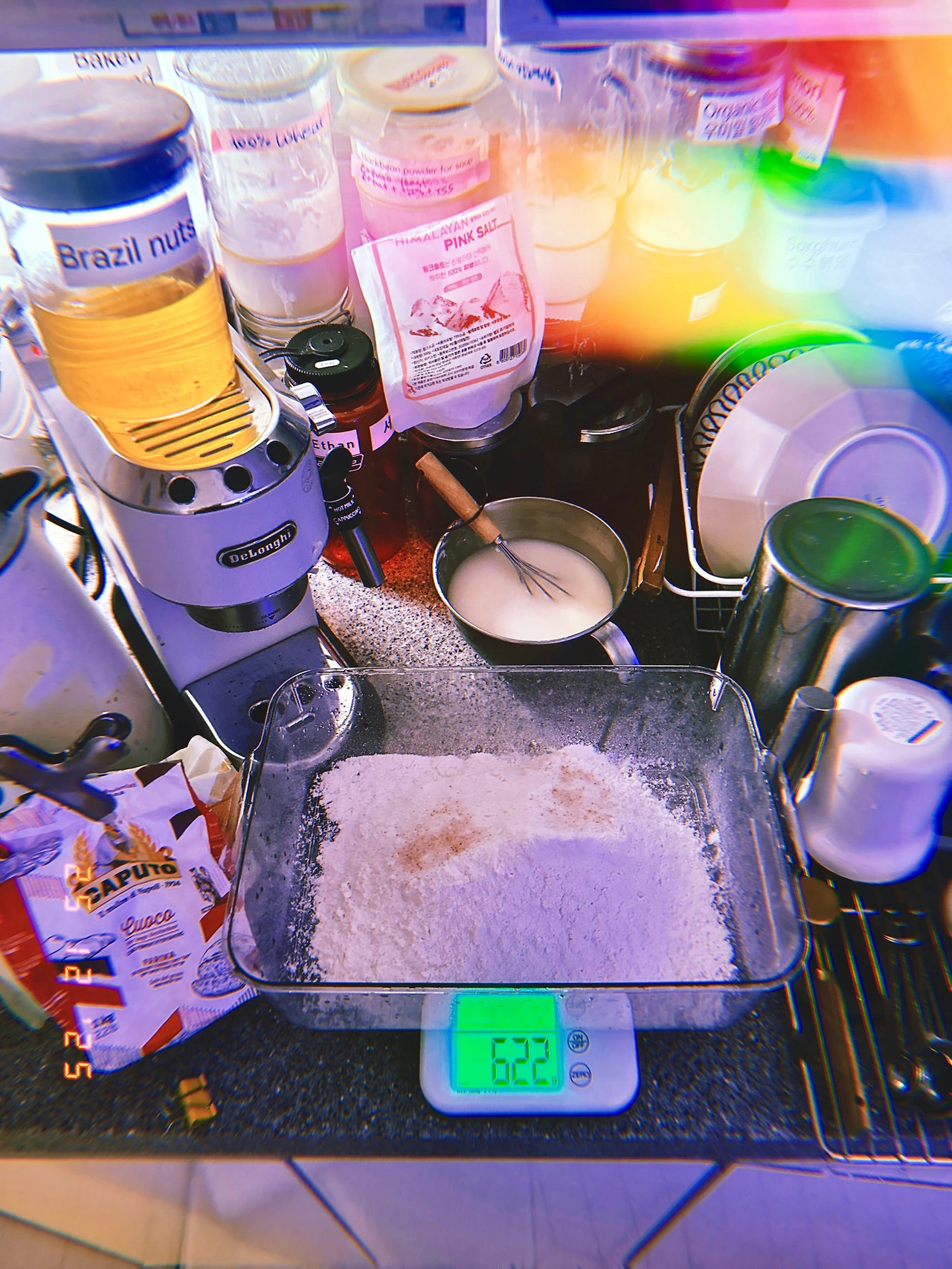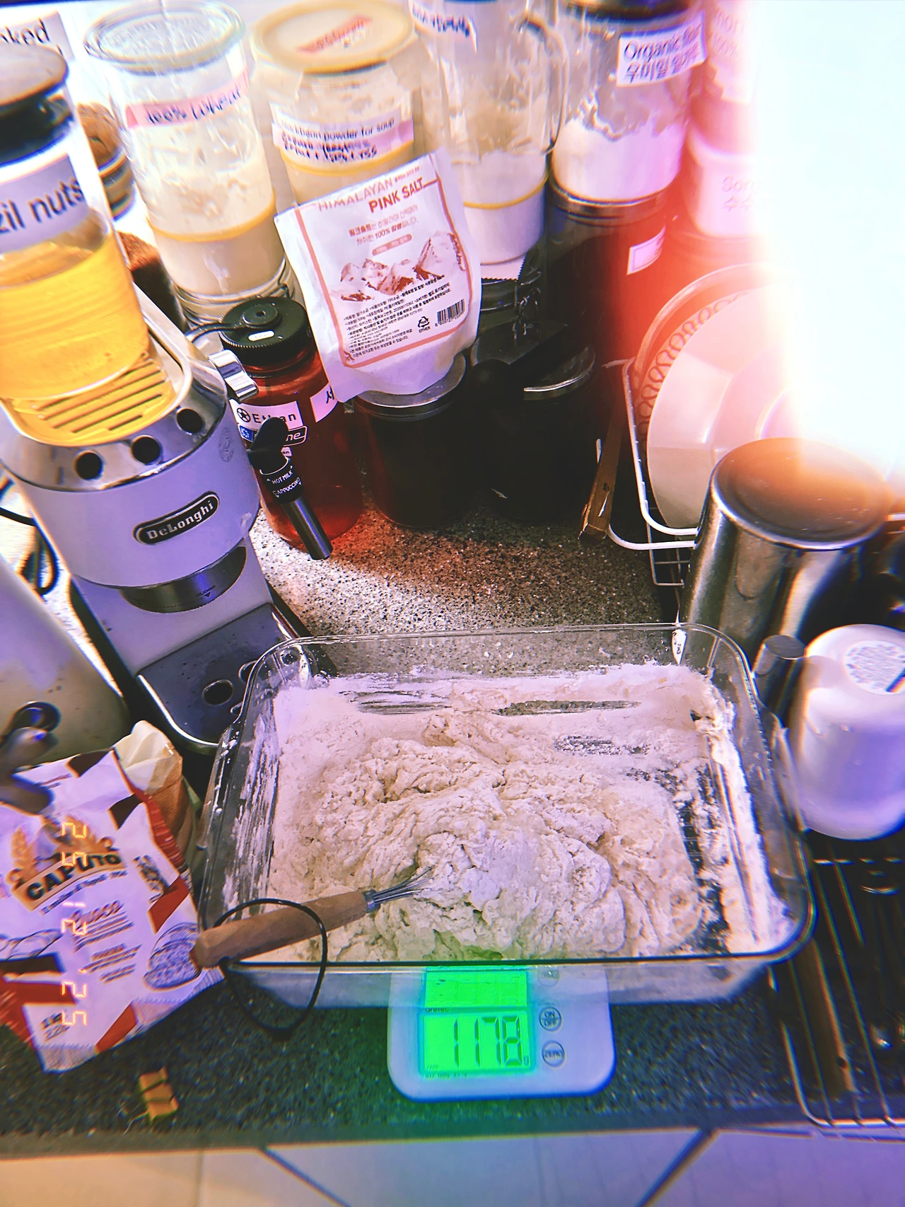 하다 하다 옷 수납 하는 통에 반죽함. (넘쳐흐름 방지) 르방이들 밥 주고 난 주걱으로 <르방+드라이 이스트> 물에 섞고, 밀가루 622g (피자전용 Caputo+Bread flour) 자, back to our Christmas movie #stillChristmas