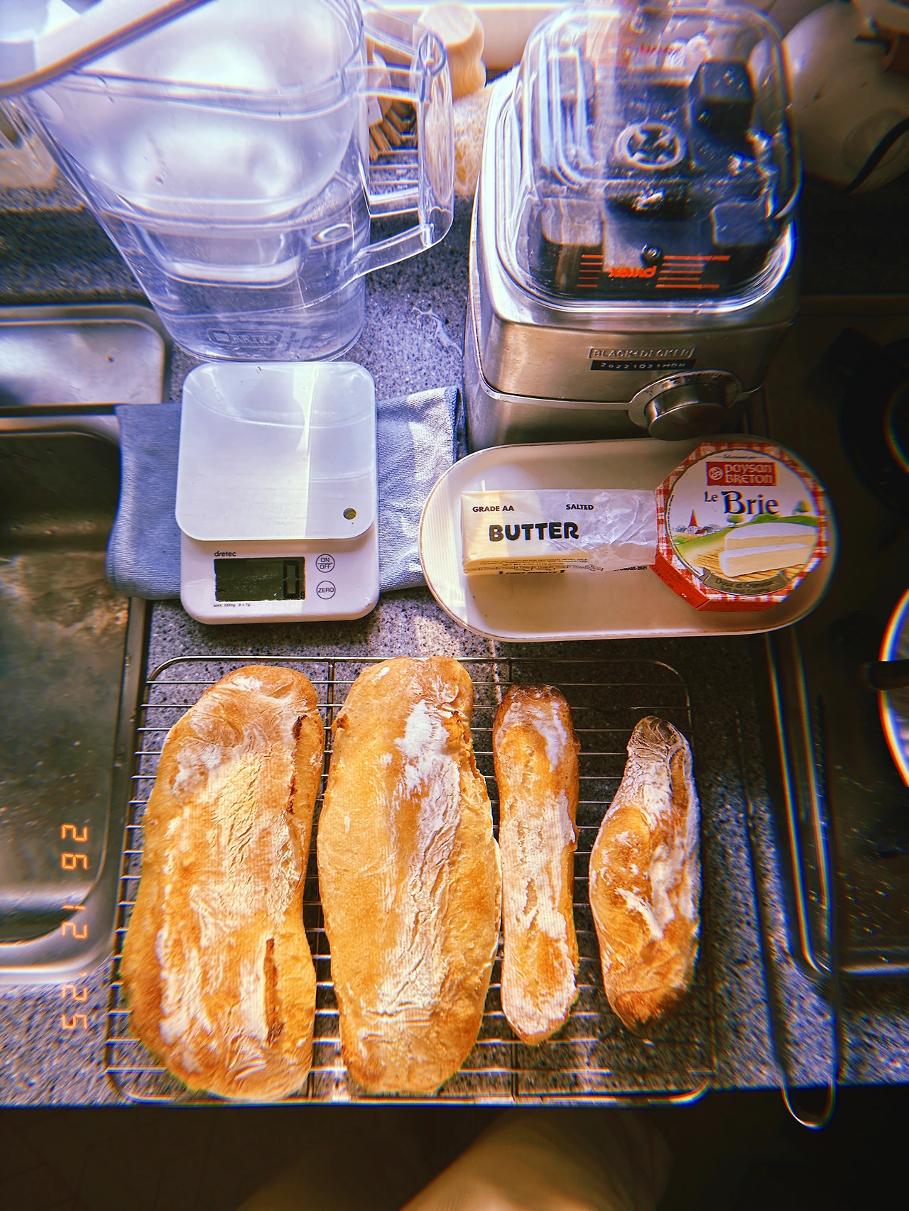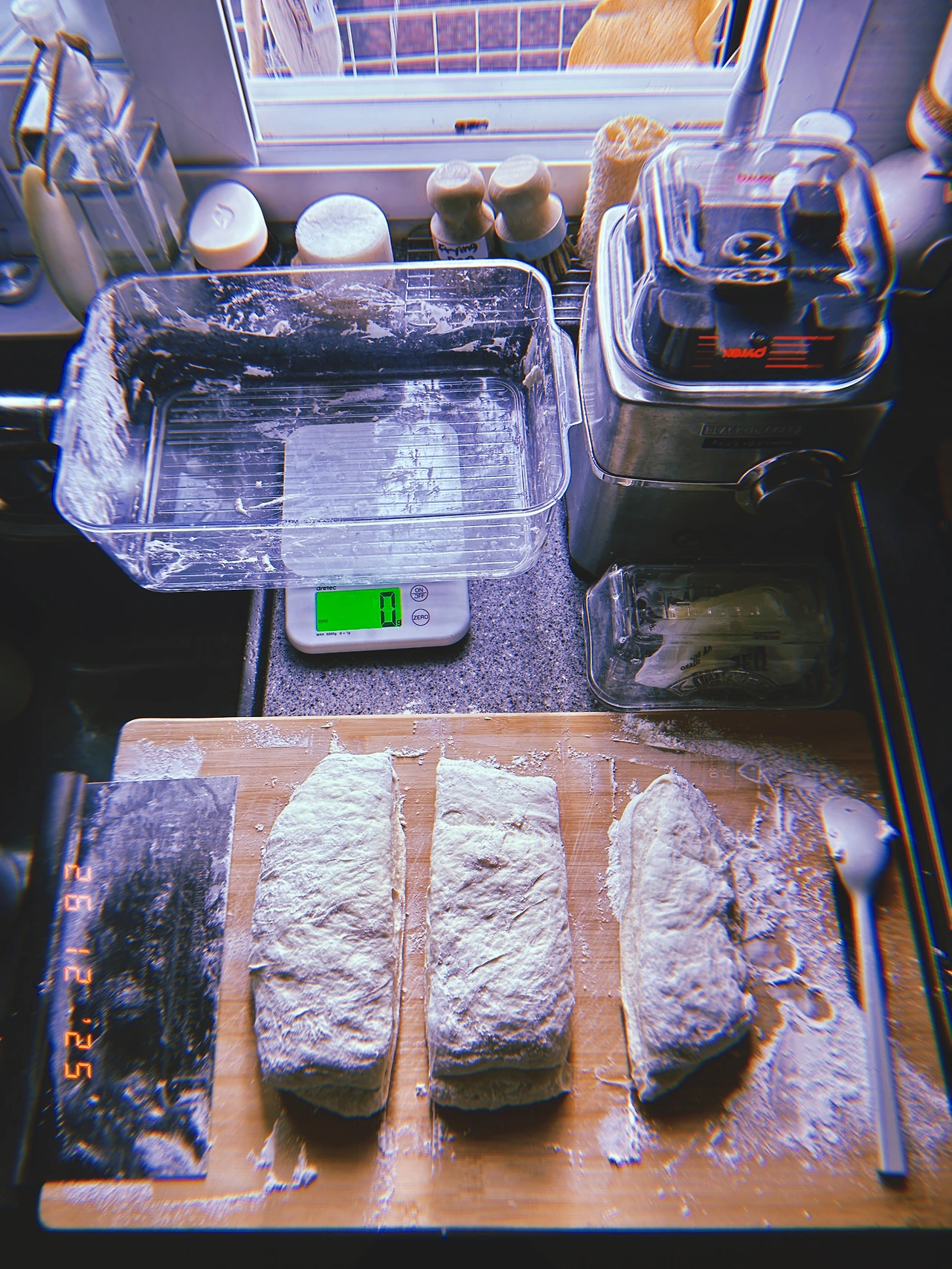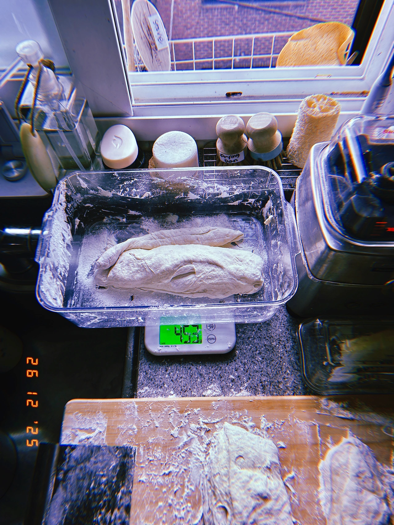 약 450g 덩어리 3개. 길게 줄 세웠다가 샌드위치 고기 잘 안 들어간다고 어떤 영국 사람이 뭐라 할까 봐’’ 다시 짧게 구겨서 굽. 모유에서 분유로 넘어갈 때 모유 양 줄이듯 드라이 이스트 양 매일 조금씩 줄이고 르방이들 비율 높이는 중. 맛은 둘 다 좋음. #Sunny-7 #F26Dec2025