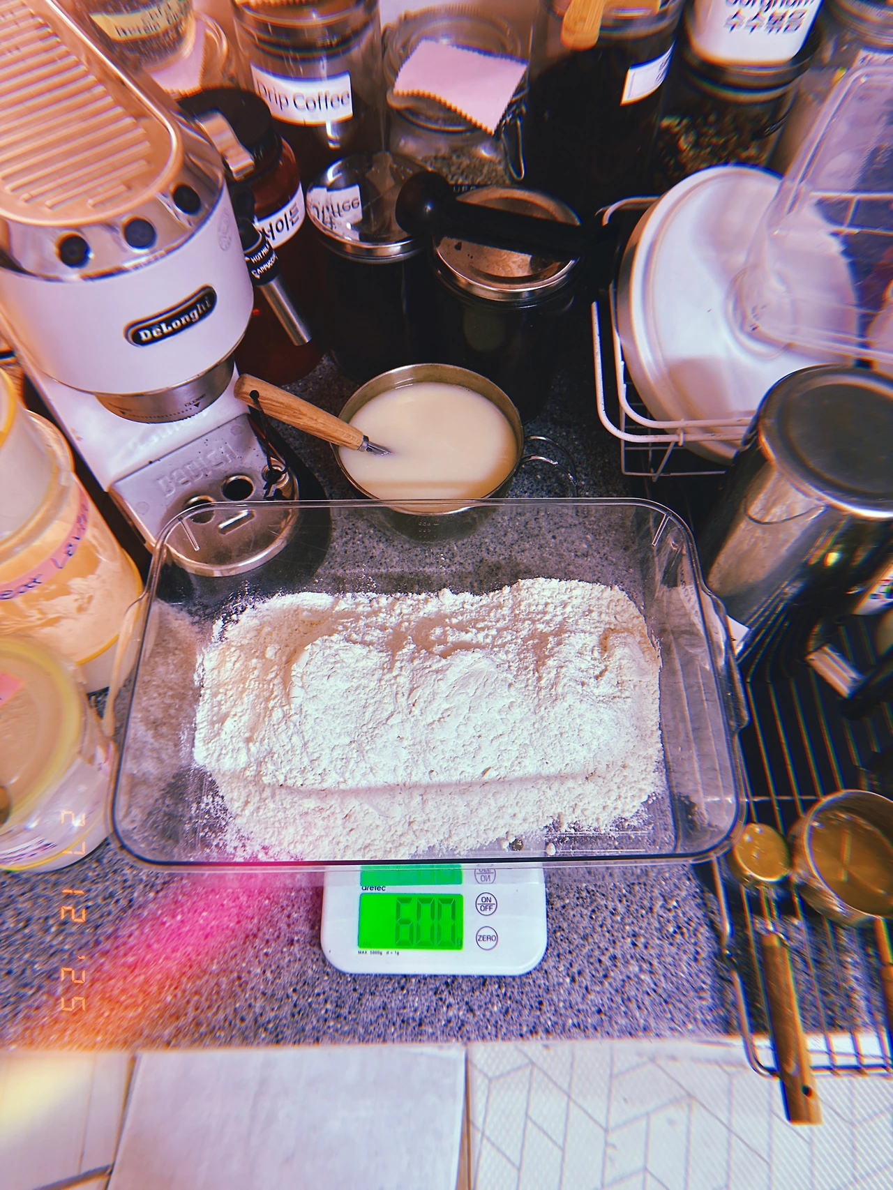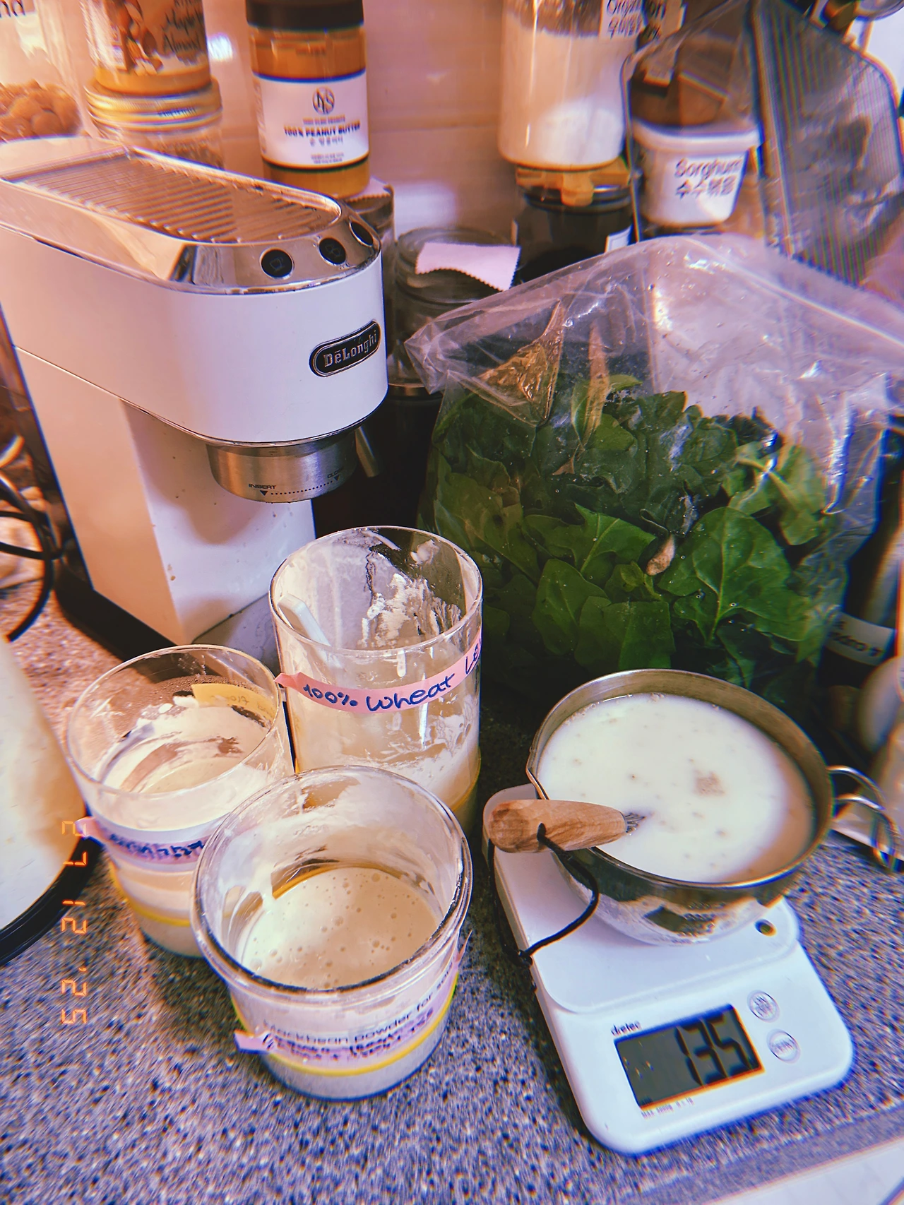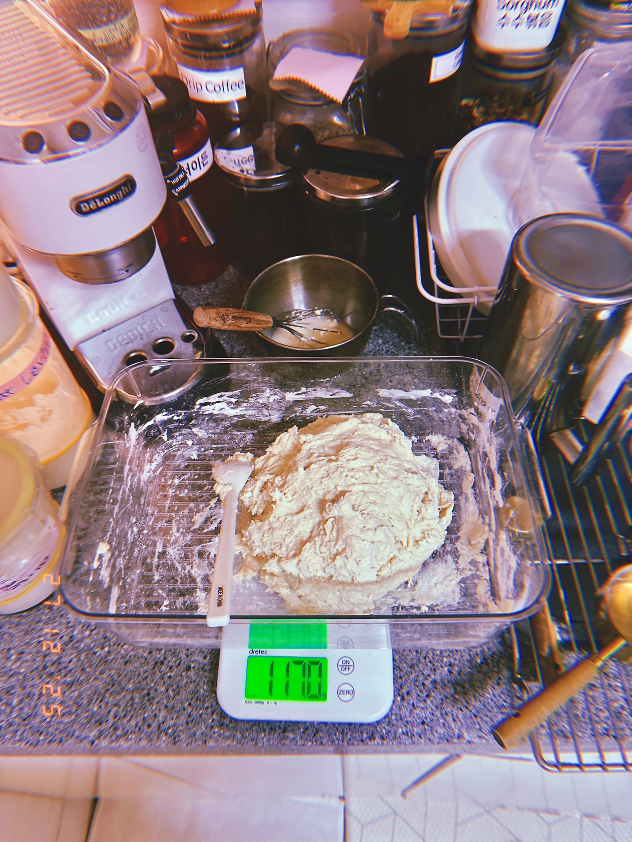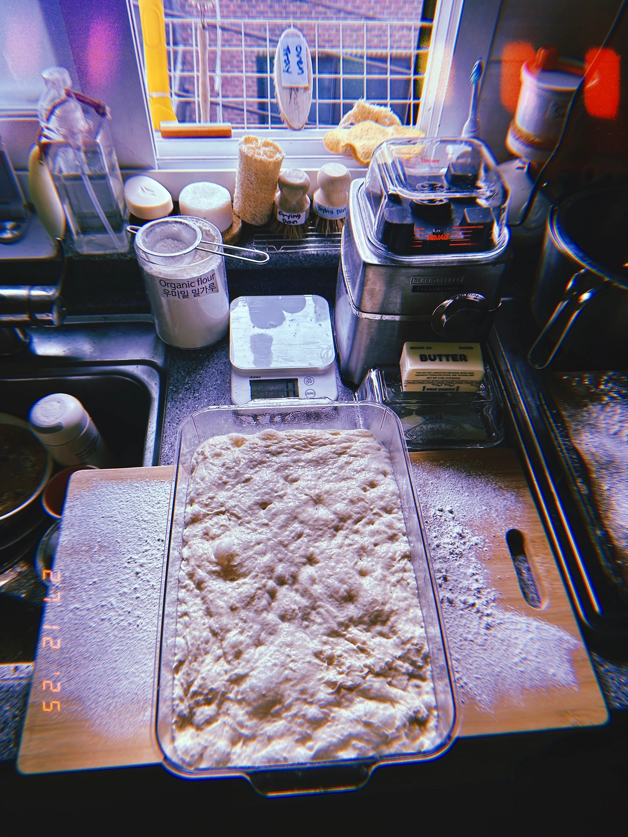 퇴근 후 에너지 고갈되어 크리스마스 선물로 받은 잡채에 밥 한 주걱 올려서 한 통을 깨끗이 비우고 나서 누구보다 빠르게 움직여 저녁요리 재료 <minced beef> 사온 다음(그날 산 고기가 아니면 안 먹는 어떤 고기주의자/ 냉동된 고기도 안 먹음…) 르방이들 반죽물에 덜고서 밥 주고 내일 바게트 반죽 600g(프T55+강력) 열심히 섞어 발효 시작. (이거시 나의 운동)