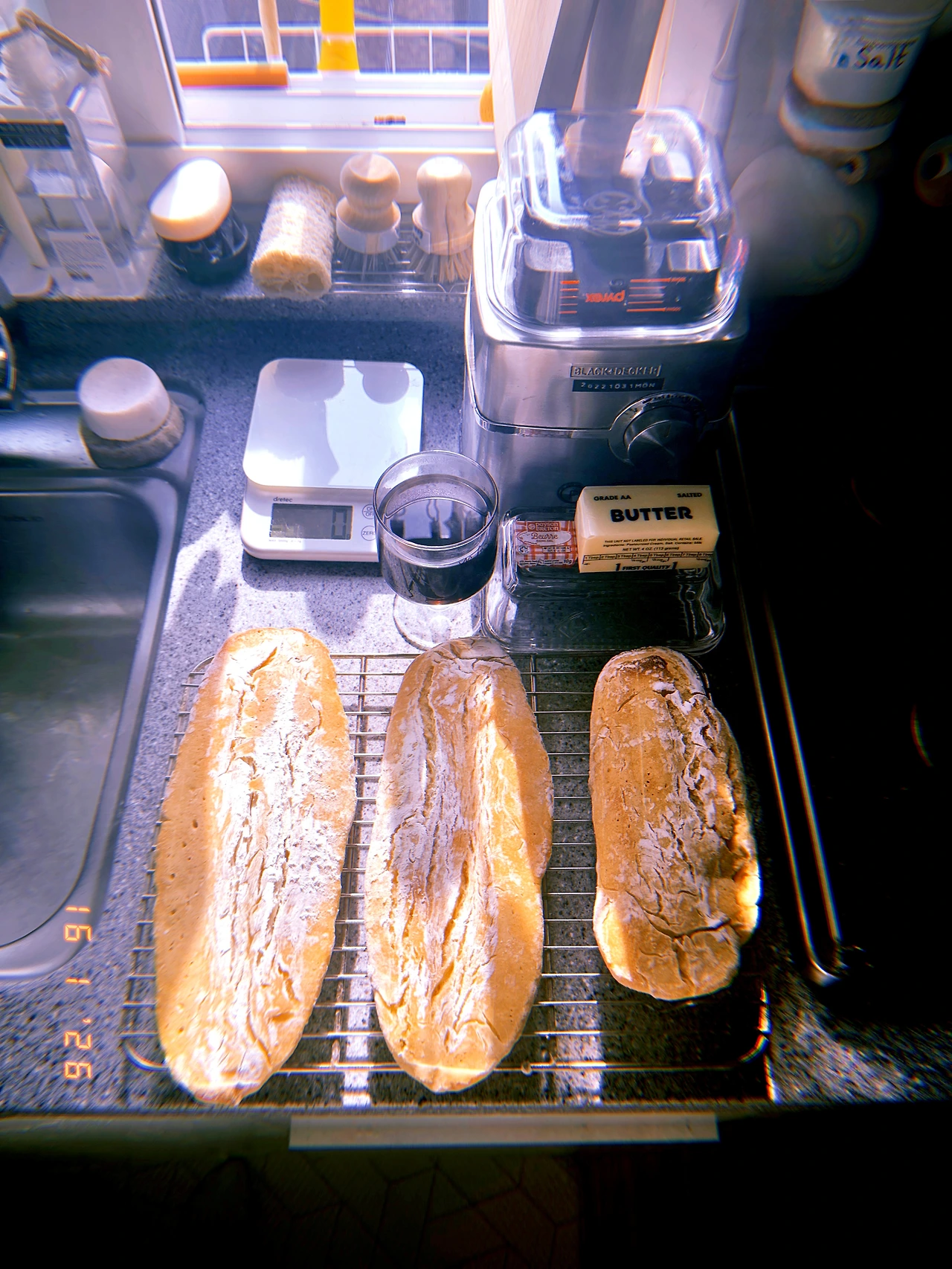 일주일 만에 외출. 율 어린이 재활 치료 위해 한 시간 일찍 바게트 굽고, 뜨거운 빵 소창 행주로 감싸서 찢은 다음 버터 덩어리 쏙 넣어 손에 쥐고 잭이 내려준 커피 와인잔에 한 모금 마시고. 햇살 눈부시당 #Sunny0 #F16Jan2026