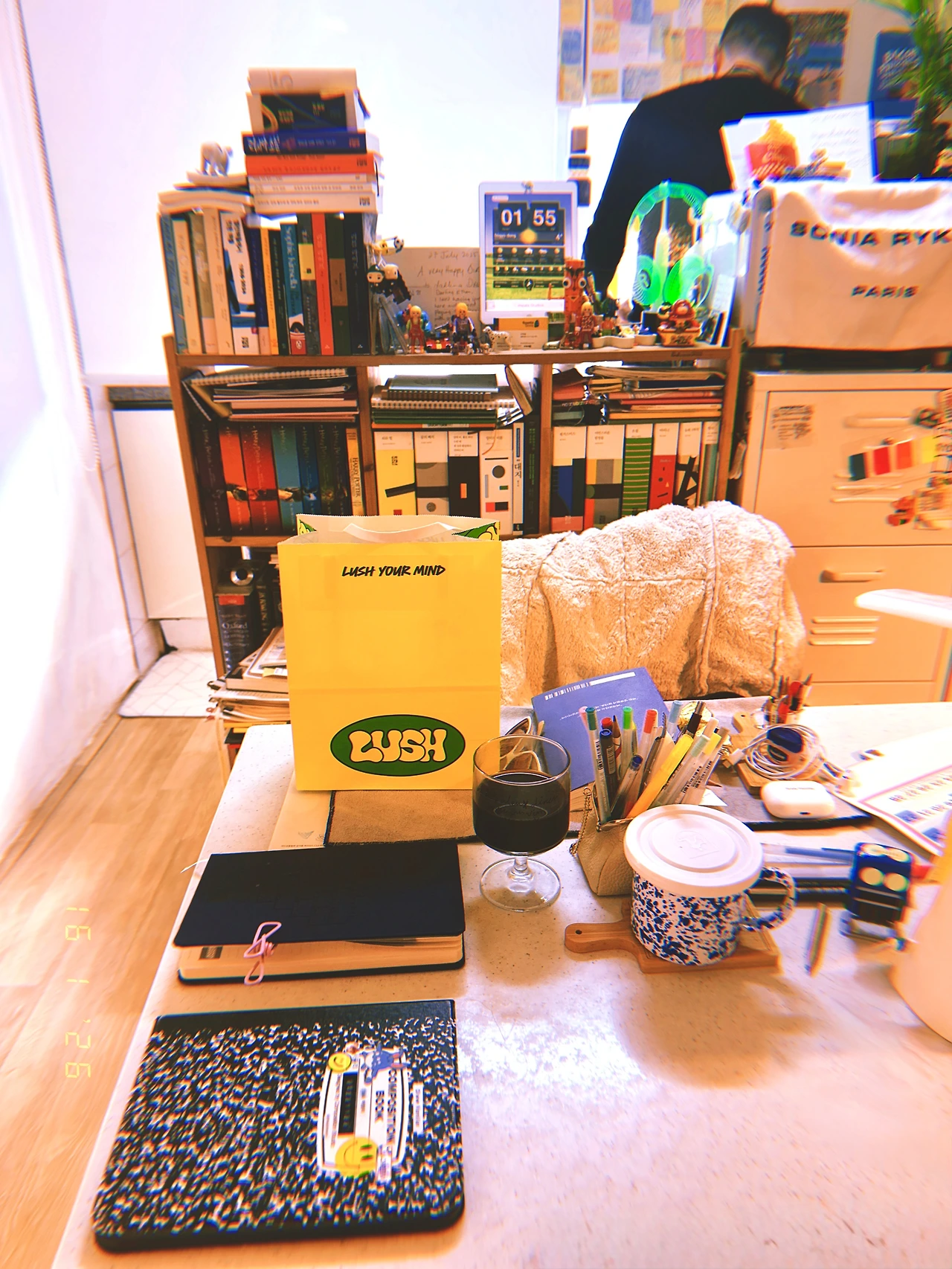 #출근 하니 내 책상에 (지금 저 짝에서 샌드위치 만드는) 어떤 영국 사람이 <러쉬> 핑크 샤워볼, 우리 어린이가 일기장 올려두었다. 학생분(어느 대기업 높으신 사람)에게 그의 와이프 갱년기 우울증을 풀어드릴 아이디어 내줬다가 너무 고맙다면서 그가 내 것까지 사줬다는 거다. 거짓말 1g도 못하고 안 하는 영국 사람.. 핑크 하트 뿅뿅 박힌 비누를 얼굴도 모르는 ‘남자’에게 받은 기분이가 미묘 난처하네..�
