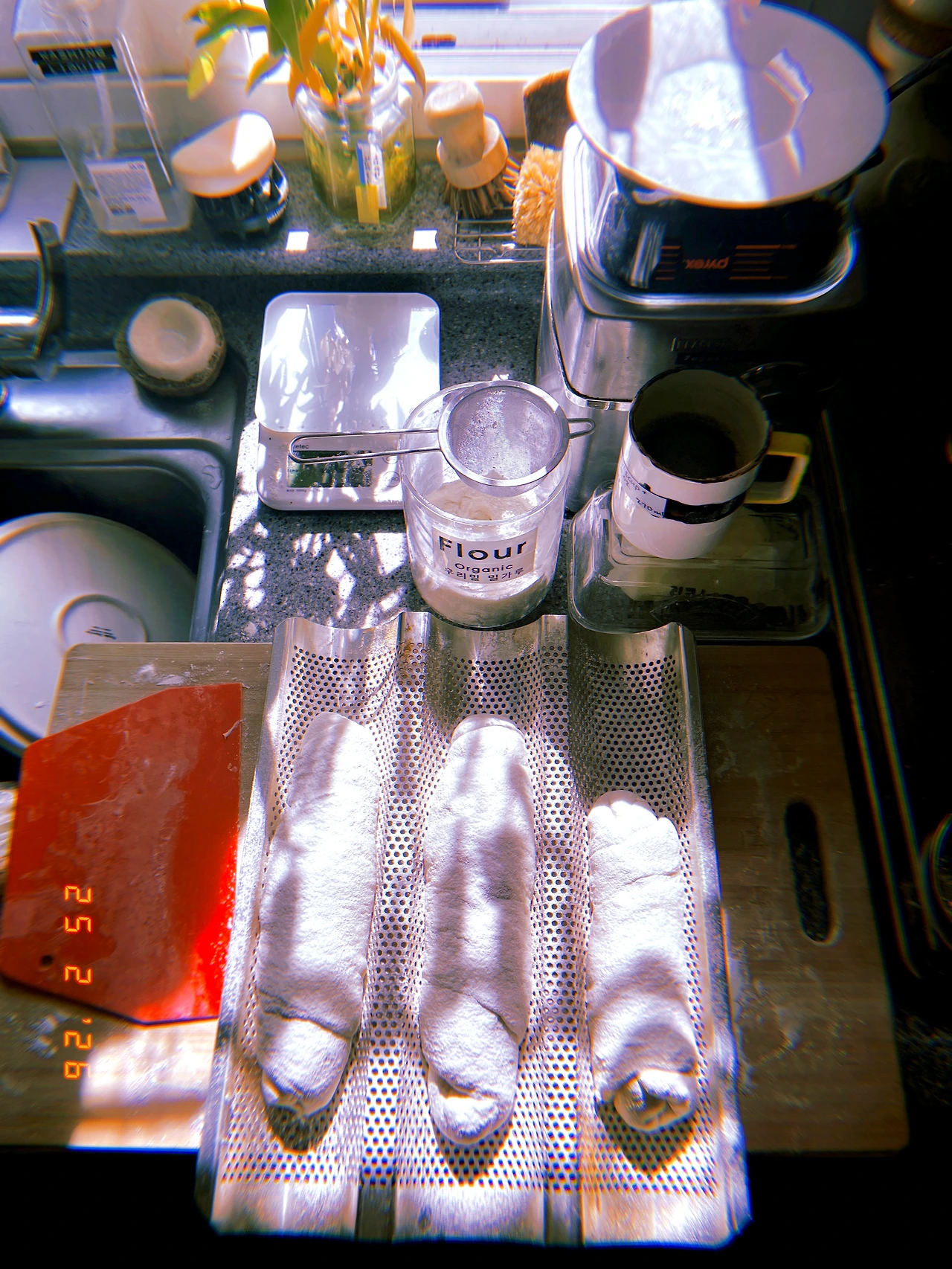 오늘 아침 작업대 현장.✨ 영국 사람이 축구 경기 가는 청소년 배웅 해주고 케사디아 사다 줘서 베이킹하면서 간식+더블 에스프레소☕️ 오늘도 못난이 바겟과 치즈와 얼린 버터의 행복.-o- #Sunny10 #W25Jan2026