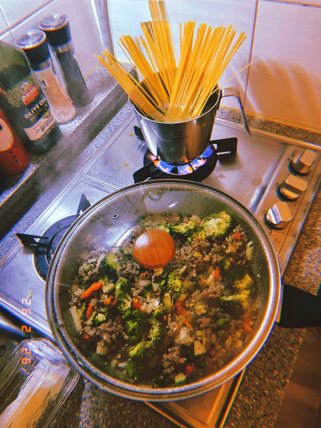 낮에 영국 사람이 사온 다진 고기와 브로콜리 한 박스 도착하여ㅡ르방이 먼저 밥 주고ㅡ<콜라비 브로콜리 양파 바질 오레가노 파슬리 Beef Ragù>만들면서 스파게리 삶은 다음 오늘은 다 섞어서 영국 사람 접시 따로 주고 나와 율은 <치즈로 덮어> 늦은 저녁 완료+뒷정리 끝난 시각 10.25pm #R26Jan2026