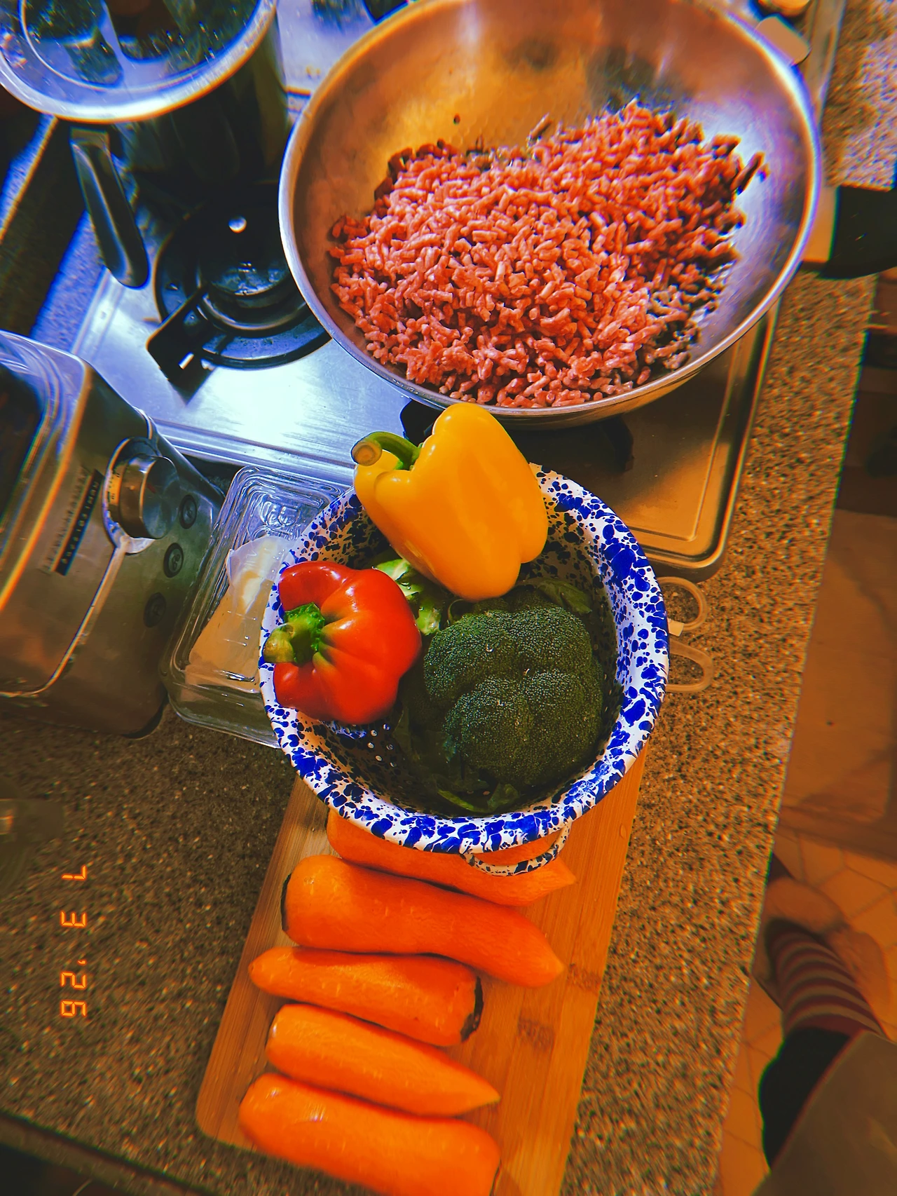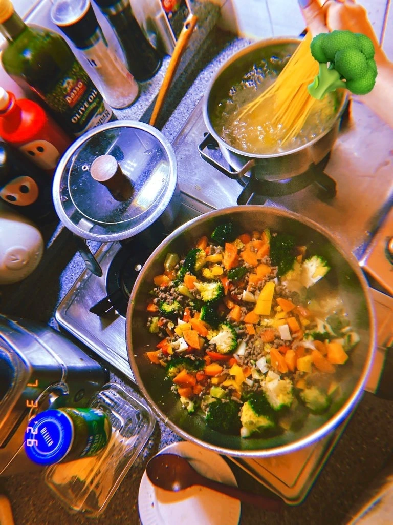 르방이 너무 바닥 보이게 썼다!@@; 얼른 먹이 주고 팔 떨어지게 저어주는데 쉬는 시간 중에 쓱 와서 당근 까주고 간 청소년. 저녁은 놀랍도록 매주 같은 메뉴 같지만 오늘은 <바질 페스토+브로콜리 라구 스파게리> #St7Mar2026