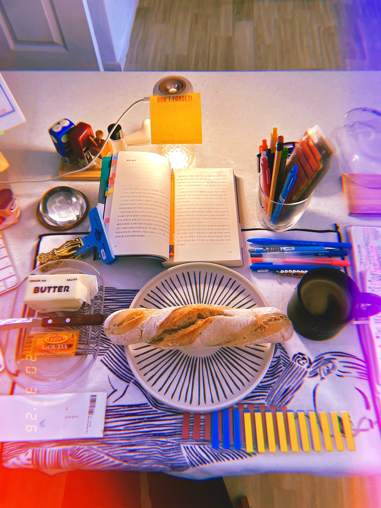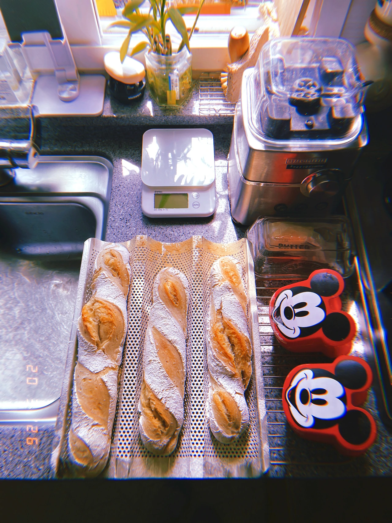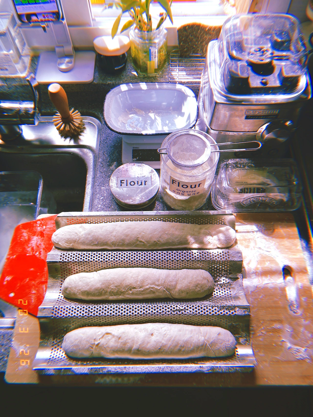 오늘은 셋 다 긴 바겟. 르방이를 밀가루보다 많게 남발했더니 반죽이 거대해져서. 영국 사람이 눌러준 <더블 에스프레소+버러+고다치즈> for bf. #바겟은거들뿐 #Fridayvibes #Cloudy10 #F20Mar2026