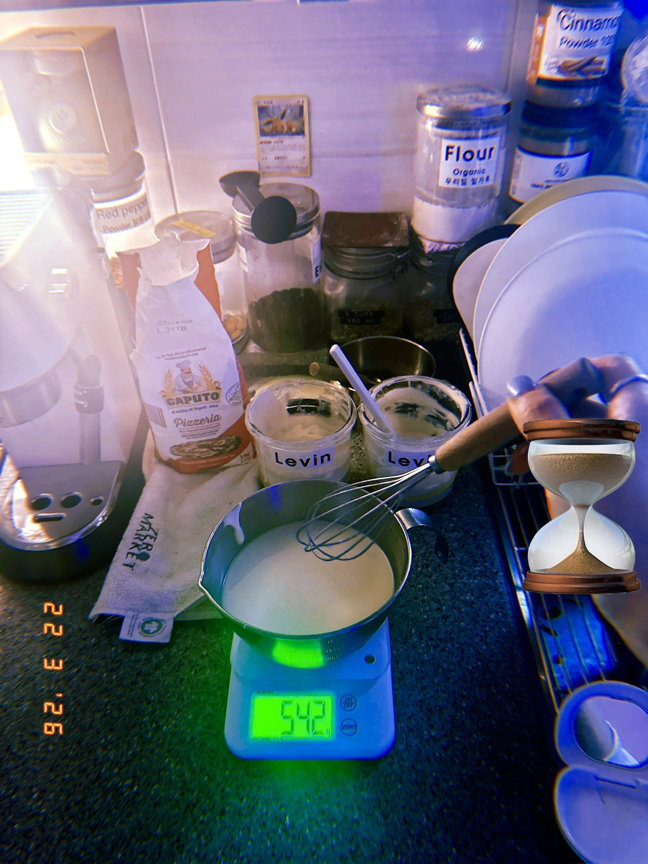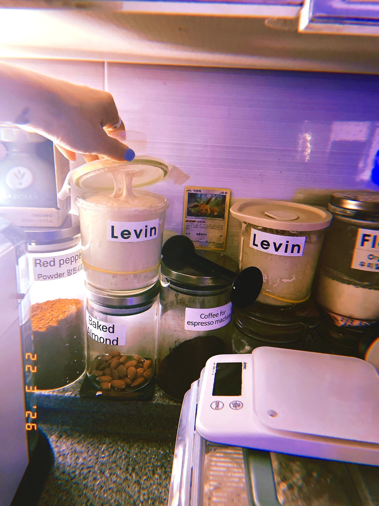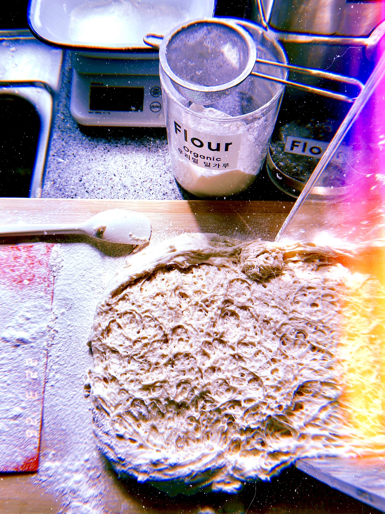 4pm 간식이 코스 식사가 되는 바람에 보이들 위한 저녁 요리 (르방이 먼저 밥 주고 내일 구울 사워도우 반죽 완료)하고 나서 같이(나도 저녁 식탁에 앉아야 함) 늦은 저녁을 늦-도록 먹고 나니 르방이가 쑥! 자라서 뚜껑에 붙어있는 거다! #일요일과월요일사이 #Dark5 #M22Mar2026