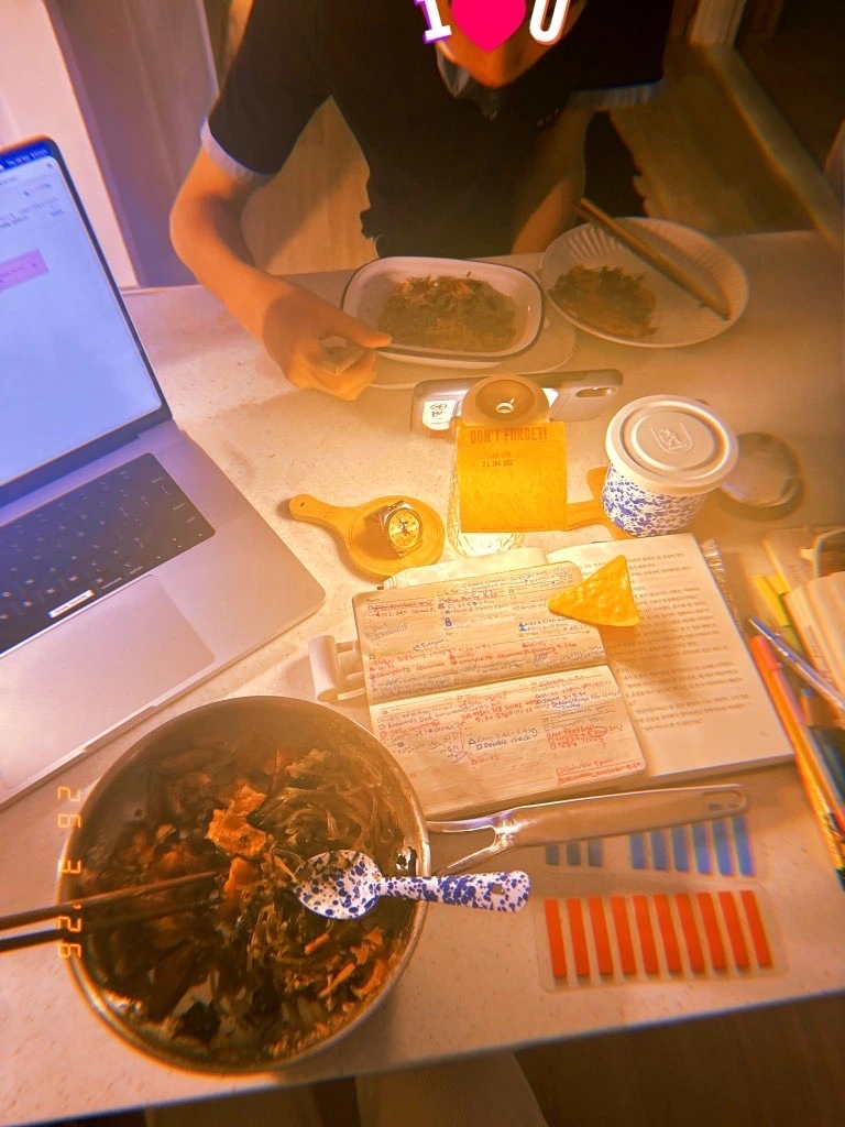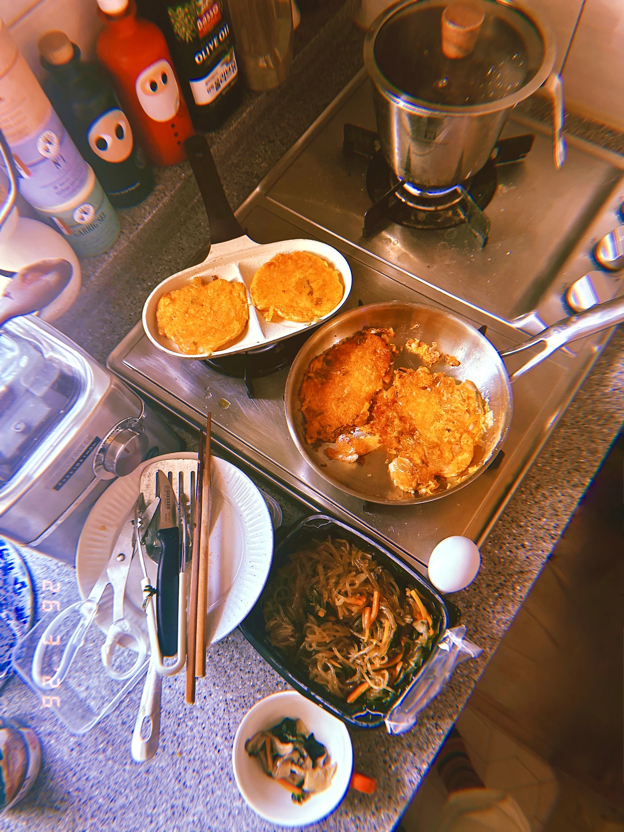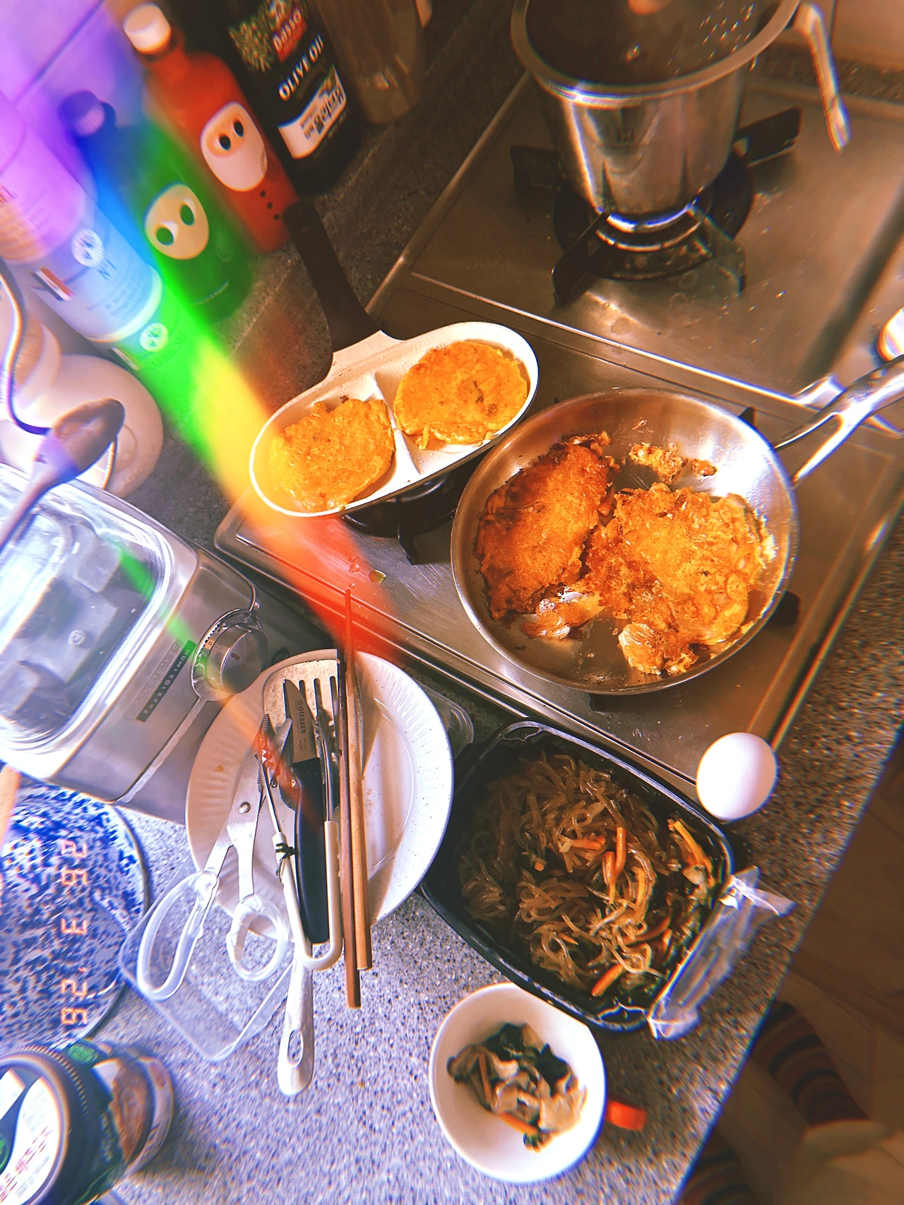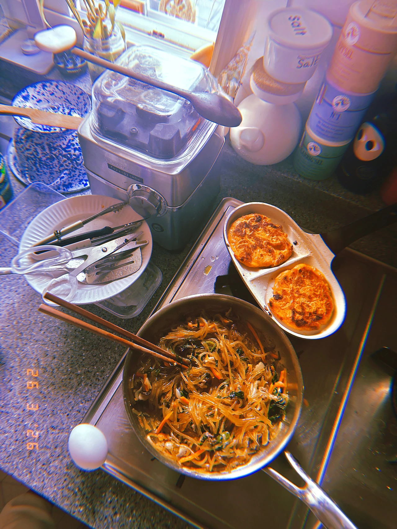 아침 난리 현장. 새벽에 일어나 어떤 청소년은 학교 가서 어제 잊은`н´ 중요한 서류 가져오시고, 난 냄비밥 하면서 오랜만에 김치부침개와 잡채 볶아서 청소년은 그릇에 난 후라이팬 째로 매우 이른 bf. #Thursdayvibes #명절바이브 #Sunny7 #R26Mar2026