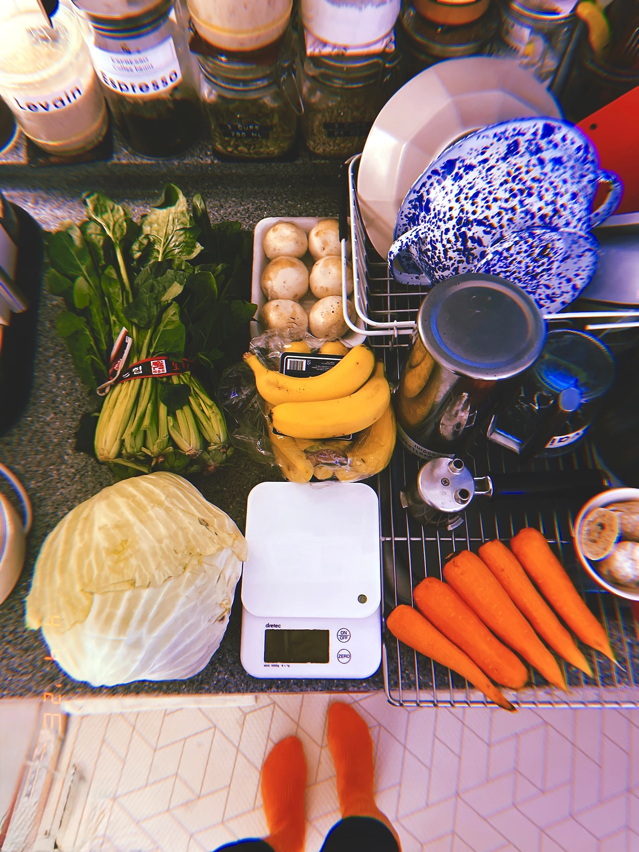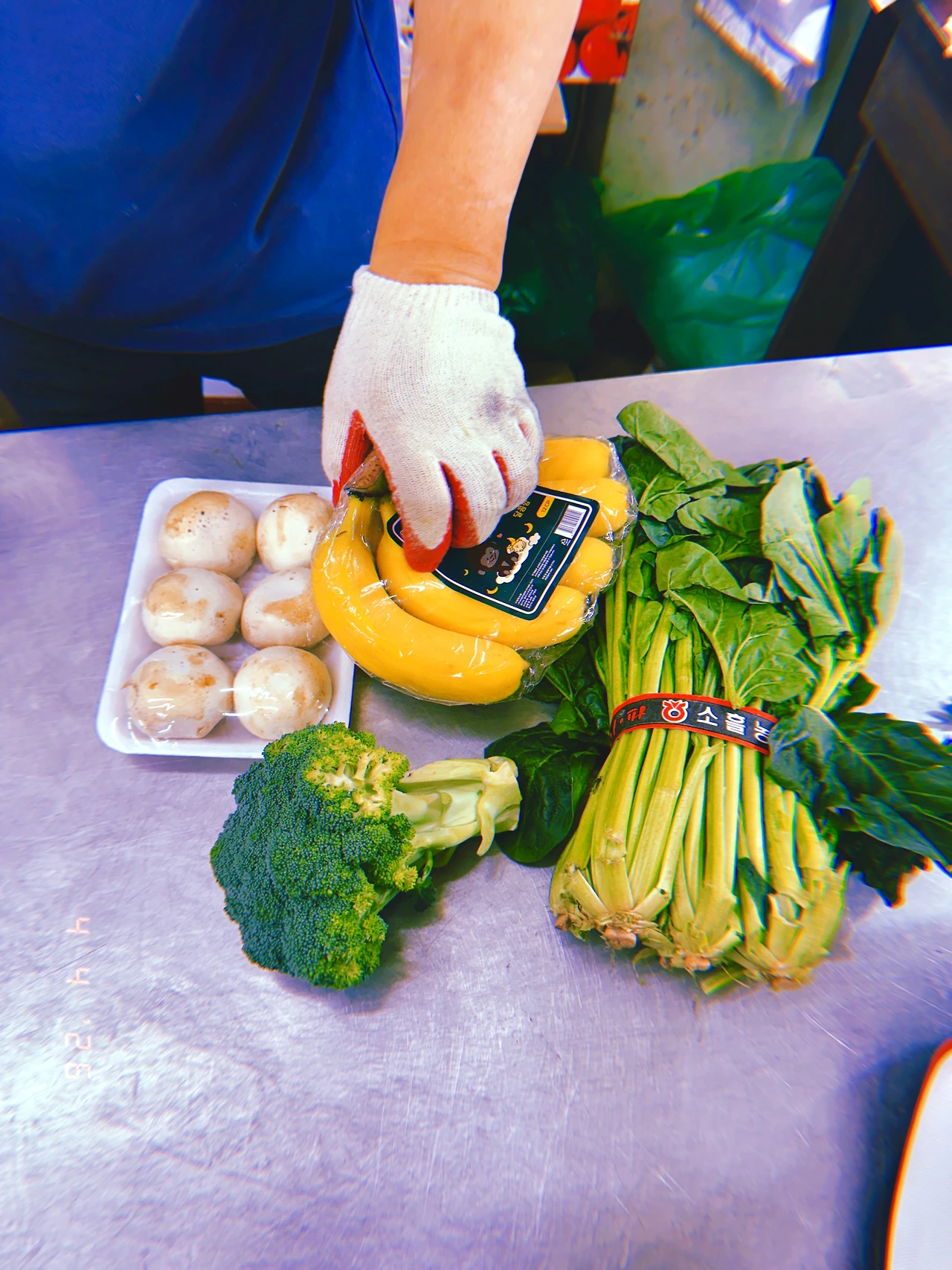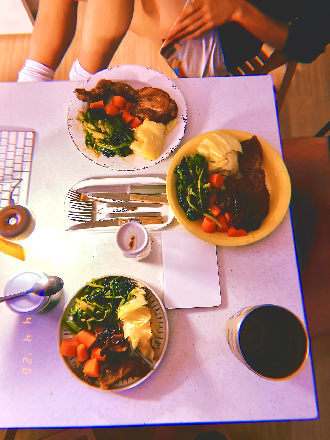 청소년이 당근 있는 거 다 까줬다.♡´▽`♡ 르방이 밥 주고 저녁 <Pork Steak w 당근 시금치 양배추 버섯(맵게)> 만들어 먹고 디져트 사러 나가는 영국 사람 따라 나옴. 아직까지 다정한 청소년이 감사한 오늘. -o-