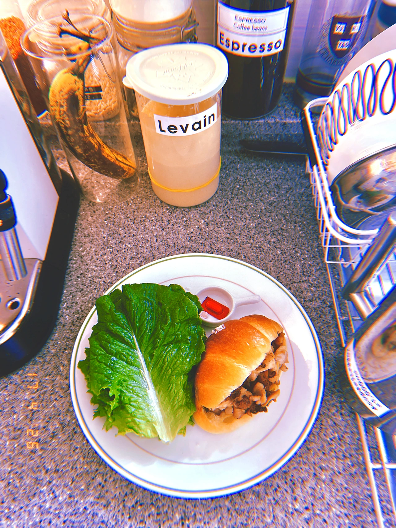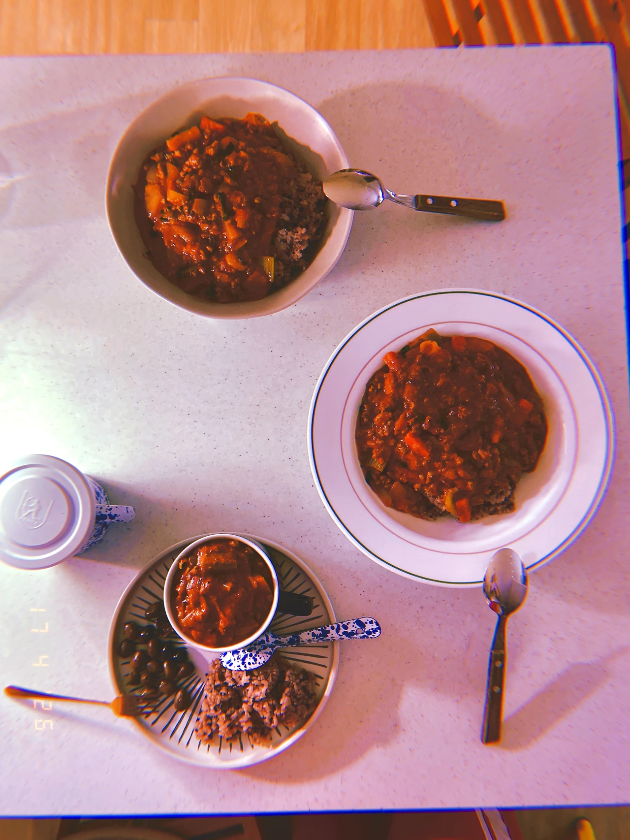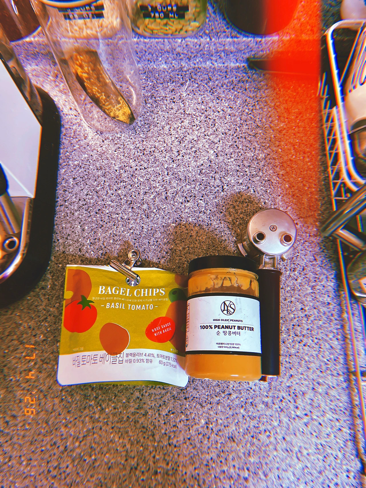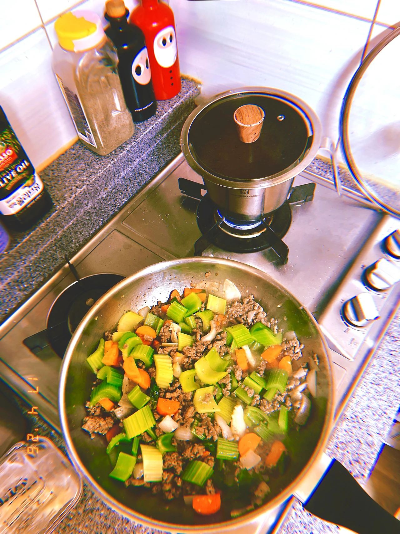 <바질 토마토 베이글 칩+피넛버러> 먹으며 힘내서 르방이 밥 주고 저녁 요리. 오늘 Ragù는 <당근 양파 샐러리+고기 1:1>, tomato purée+Curry powder로 마무리해서 냄비밥과 써비쓰. #friday