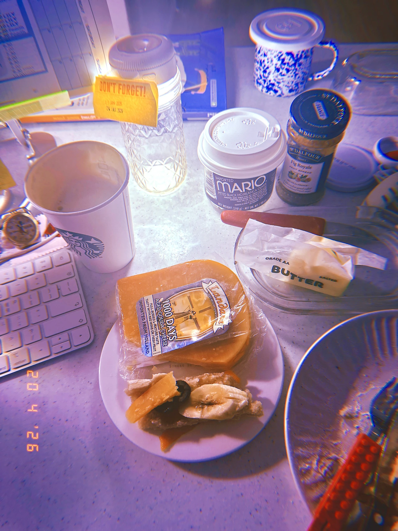 1000일 숙성 고다치즈. 까망베흐 치즈. salted butter. Fig spread. banana. black olive. double espresso for bf. (바겟은 도울뿐`v´) #내어머니의자서전 #재독 #monday