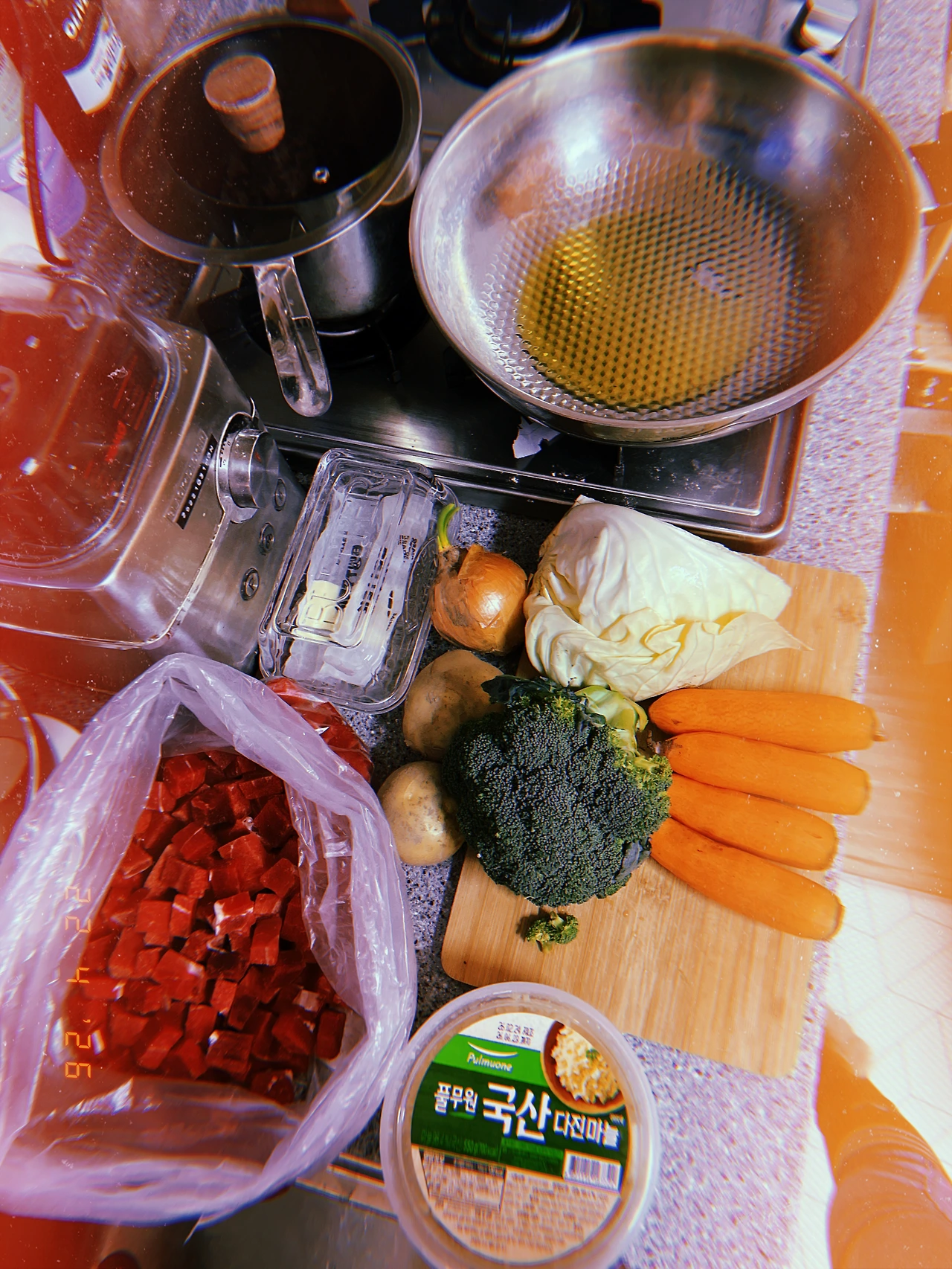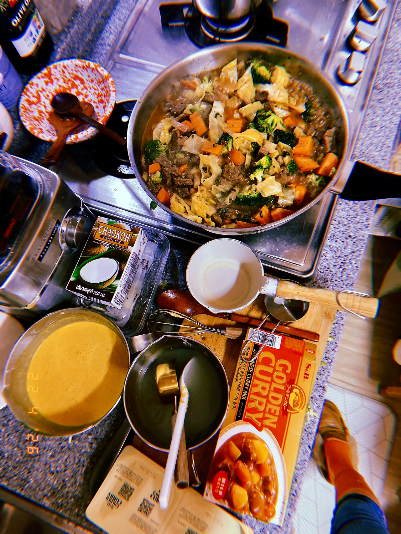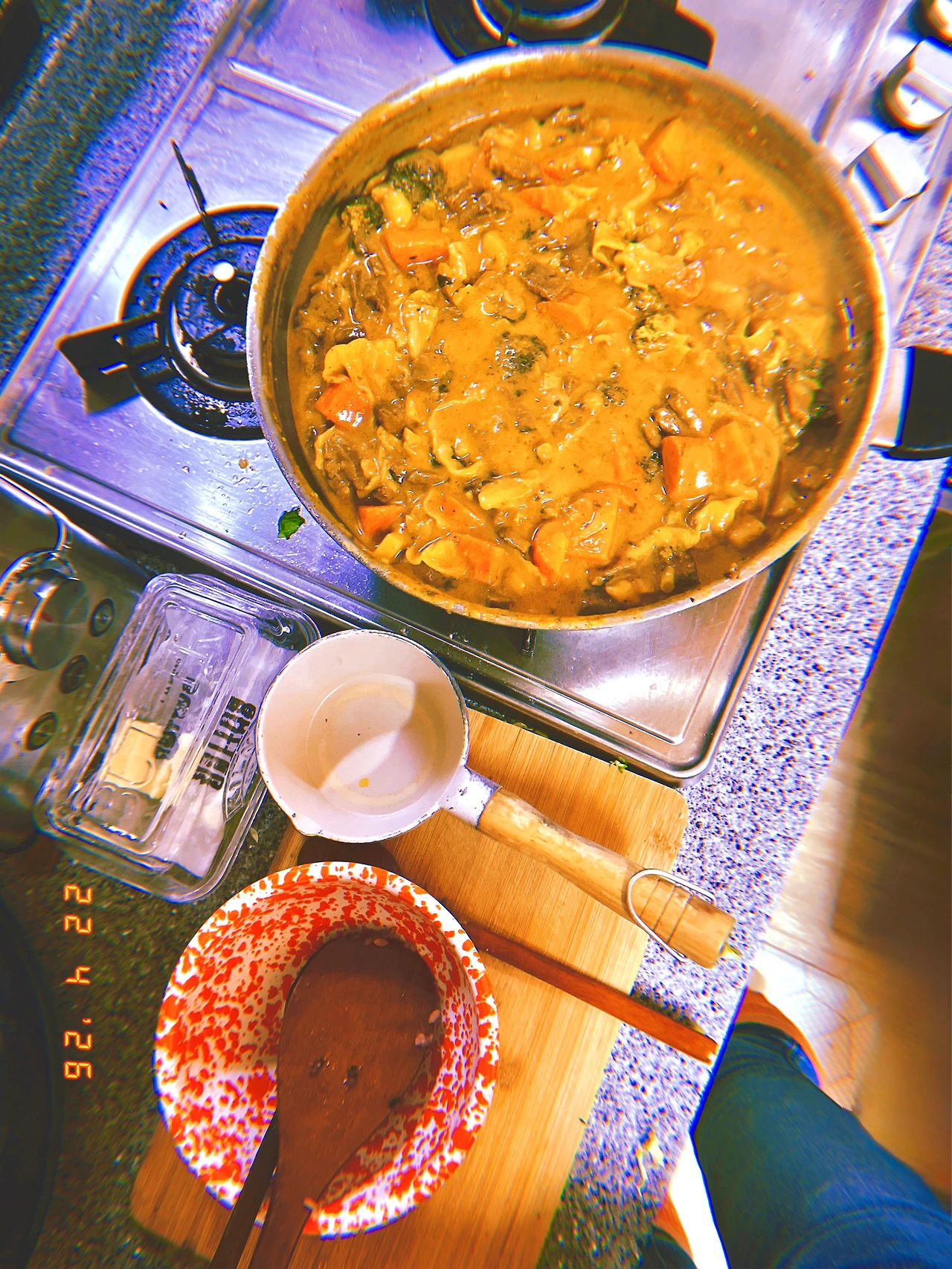 오늘 #3시 #6시 더블 간식 후 저녁 요리 <코코넛 브로콜리 당근 감자 양파 양배추 Curry> 카레까지 ‘두 그릇’ 흡입. 오늘 간식도 저녁도 더블로 가버렸다. 와인 한 잔이 많은 오바를 낳은 양상..◎_◎