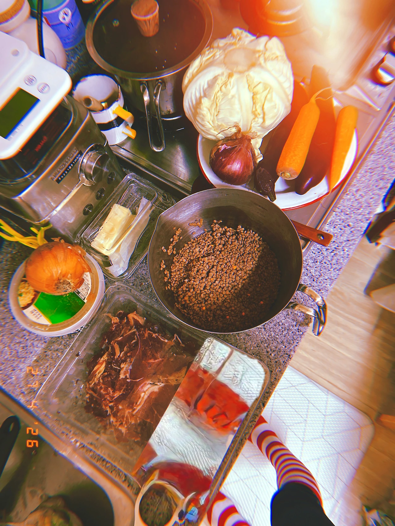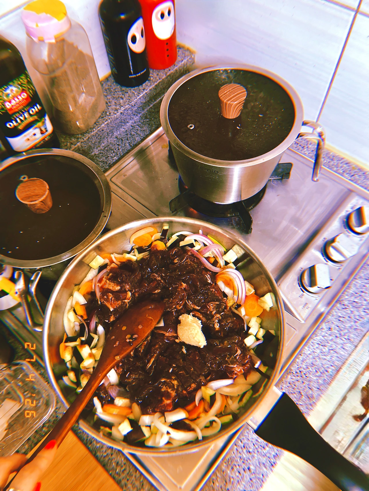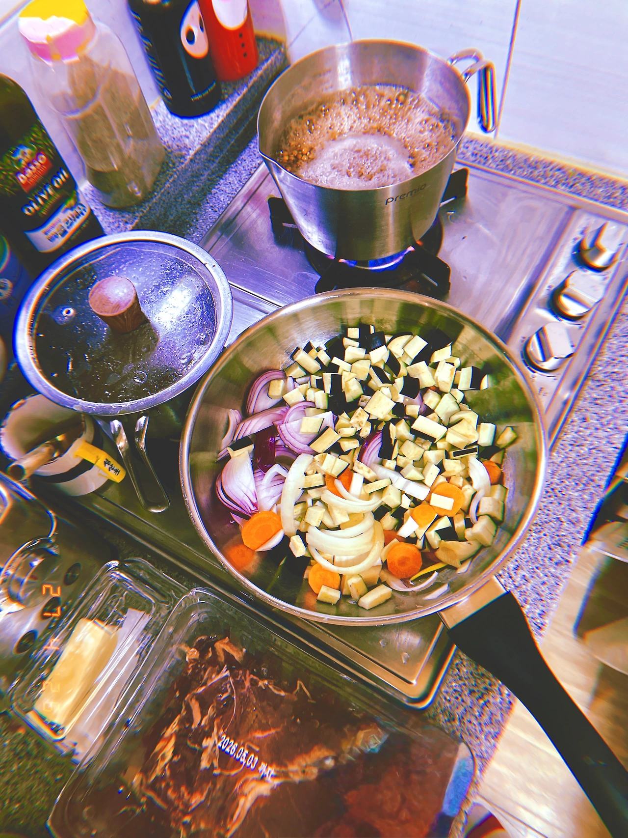 보라 양파와 보라 가지와 당근 2개씩+beef 1 kg (가지는 나도 보이들도 안 좋아해서 잘게 조사서) 불고기 ‘끓이고’ 오늘은 냄비밥 아니고 <냄비 렌틸콩> for dinner. #April27 #monday