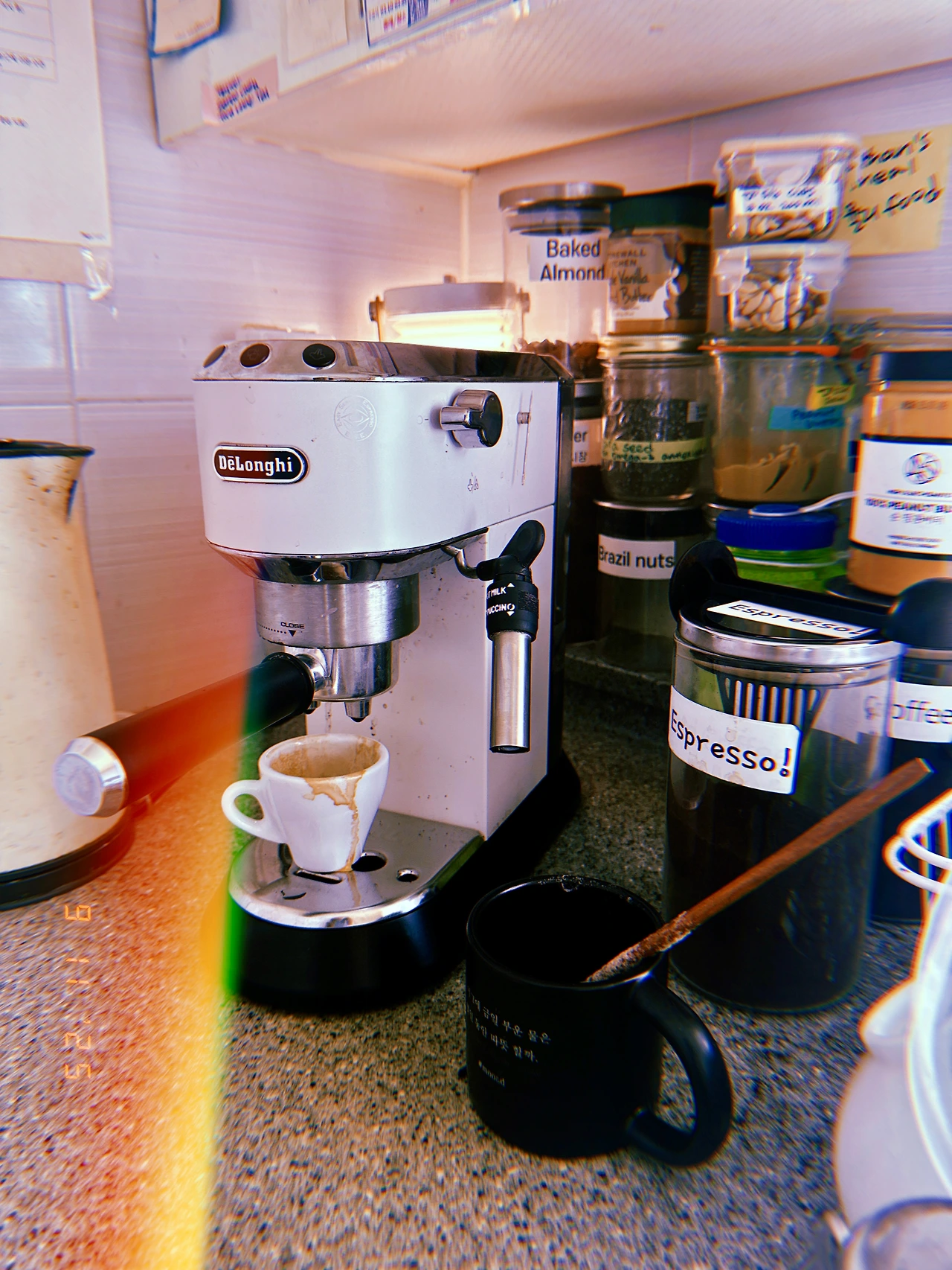 <드립 커피 필터 여과지> 잘라 에스프레소 드립 트레이에 쏙 넣은 다음 (심하게 곱게 갈려진) 원두 넣으니 너무 잘 뽑아지는 거다. #유레카! 잭이 눌러준 커피+테스트해서 쫙-나온 커피까지 오늘 <4샷 라테>☕️