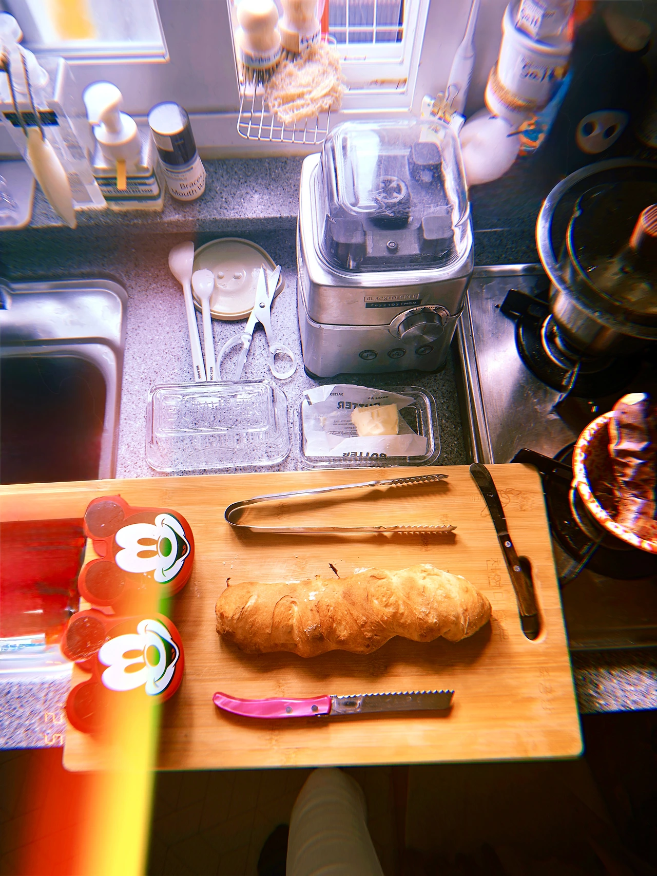 아침에 大성공한 #겉바속촉 바게트 뜨거운 한 덩어리, 내 아이폰 프로 맥스만큼 버터 올려서 for bf. Muji 세일 때 몇 가지 반찬 사둔 것 중 뜨-겁게 빨리 먹을 수 있는 <김칫국> 좋아서 (미니라면은 정말 별로) 엄마 반찬으로 밥상 차리고 계란 튀겨서 뜨거운 후라이팬 채로 for Lunch. 초록 사과 is over… 오늘부터 빨강 부사로 후식 중. 안 그래도 우리 한국 과일 크기에 영국 주민들 놀라는데 어제산 사과는 잭 주먹 한 개만큼 크다.(이자는 팔도 길어서 지하철 의자에 앉은 채로 짐 칸에 올려둔 가방 내림) #Sunny5 #M17Nov2025