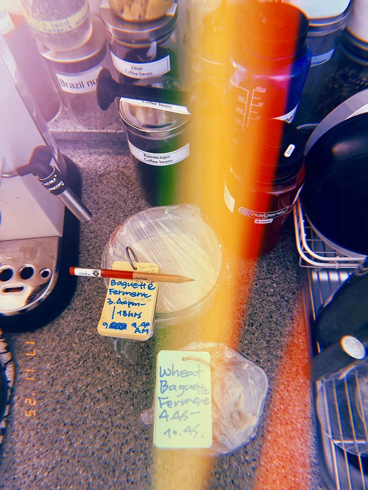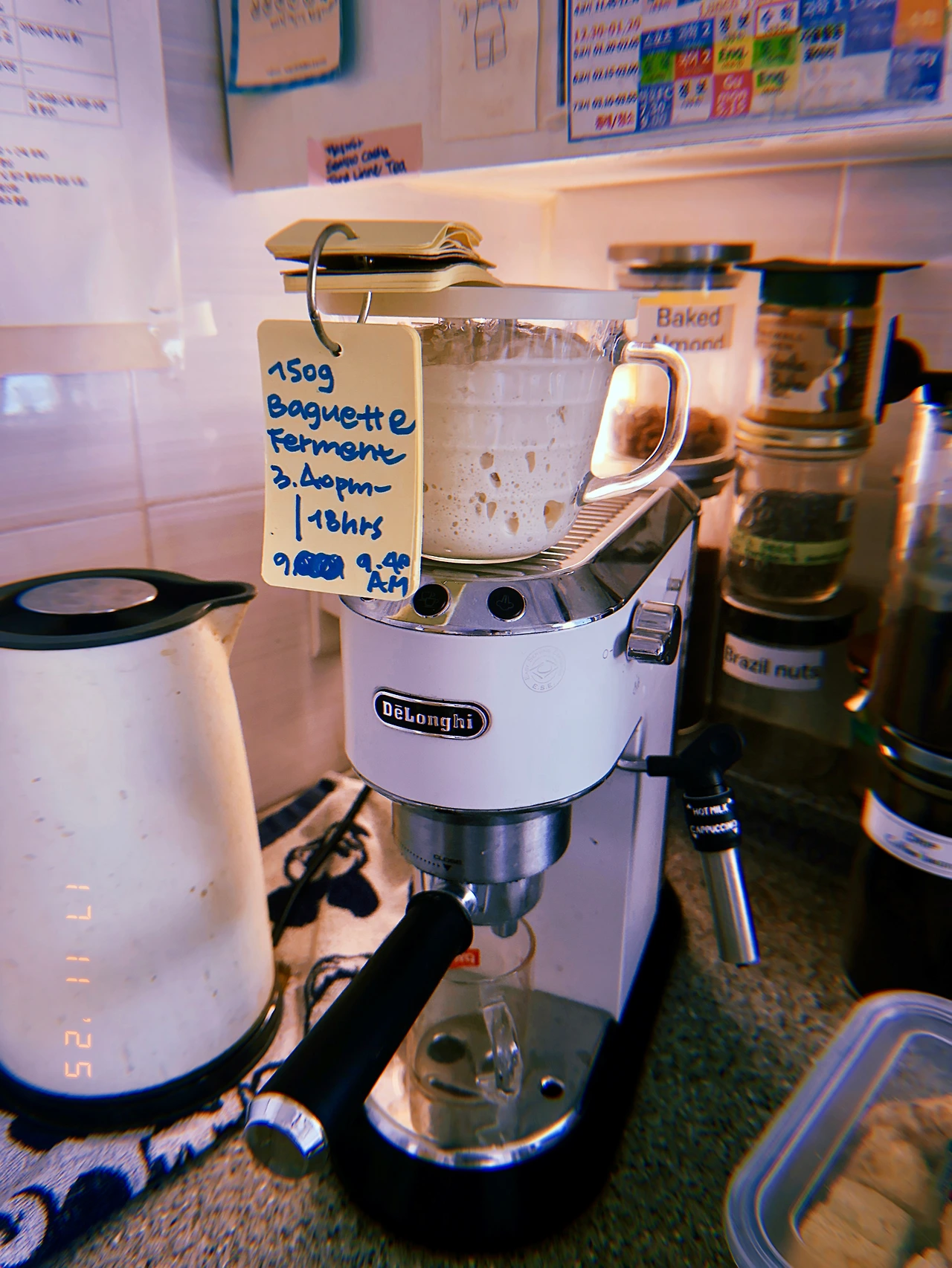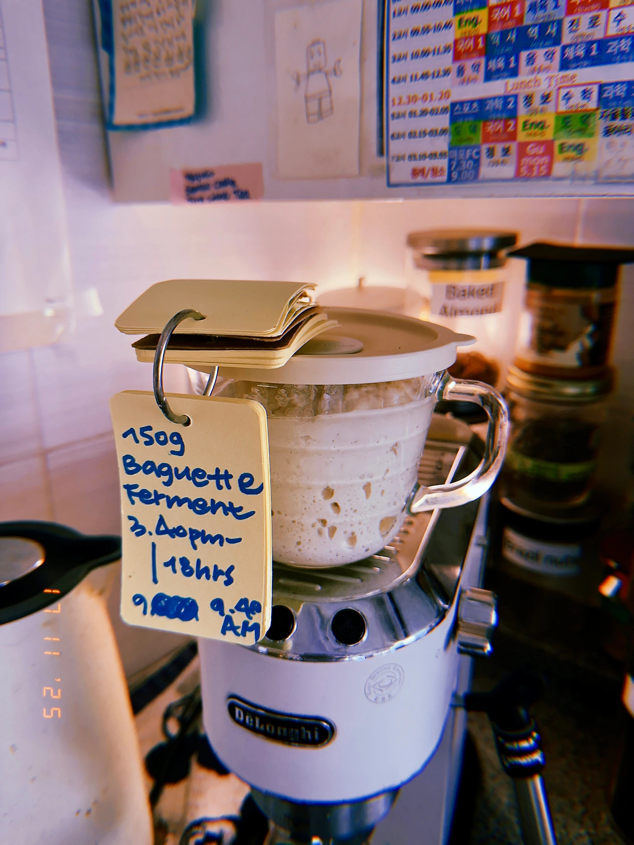 18. 정확히 18시간 발효된 반죽이 3배가 넘게 불어났다. 와우. ‘뭐든 시간이 약’ 인가. 오늘은 더 #겉바속촉 연구 위한 온도 변화. 220˚/20 min. 잭이 원두 꾸욱 눌러서 꽈악 끼워준 커피 내리고. 영하 날씨와 가까운 오늘 자켓 안 입고 나간 보이들 거슬리고. #Sunny2 #M17Nov2025