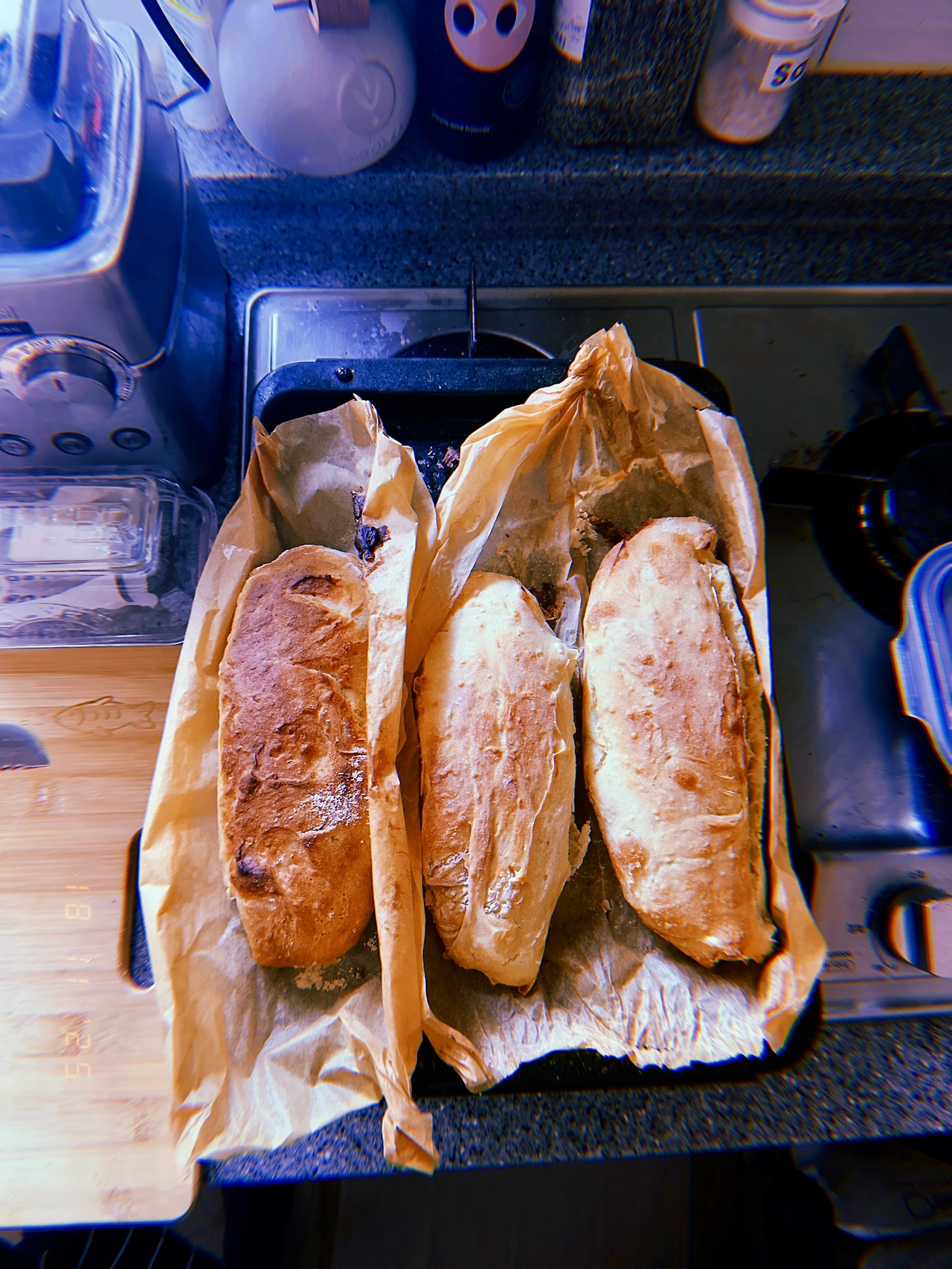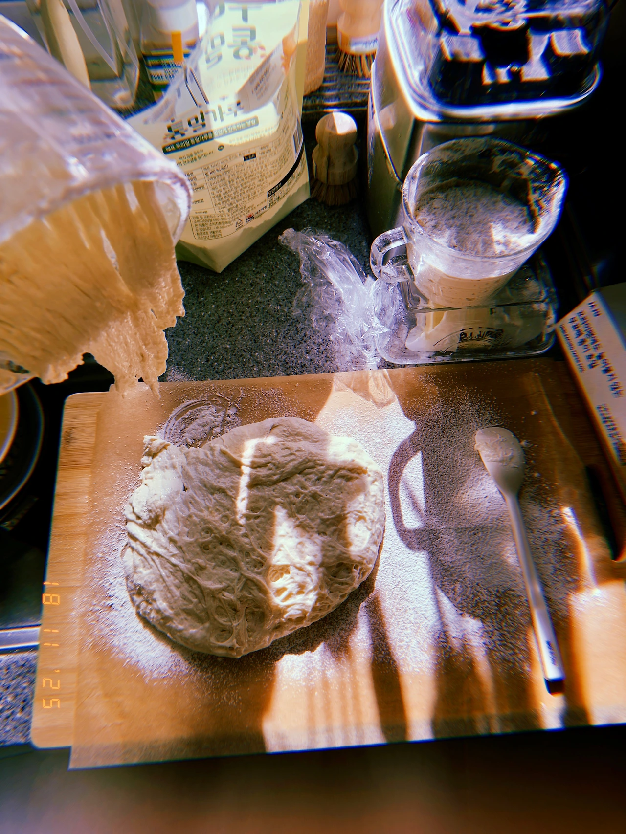 #1045AM 18시간 발효된 <통밀 1>, <우리밀 2> 뒤집어서 손에 묻히고 성형하는 대신 ‘걍’ 바로 굽고 <못난이 바게트> 얻었다. C’est pas mal 난 뜨-거울 때 오븐 앞에서 <버러+치즈> 얹어서+2샷☕️ for bf 보이들은 런치로 샌드위치 예정. 얘들아 굿럭 #Sunny-2 #T18Nov2025