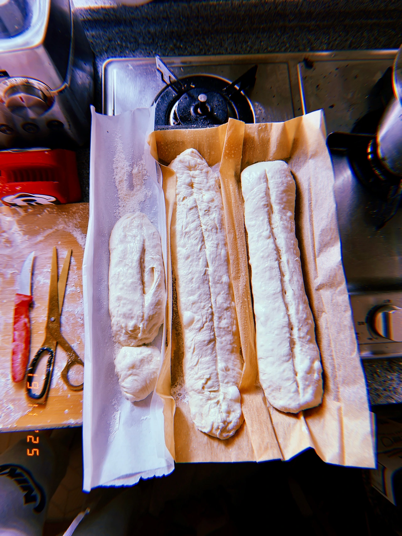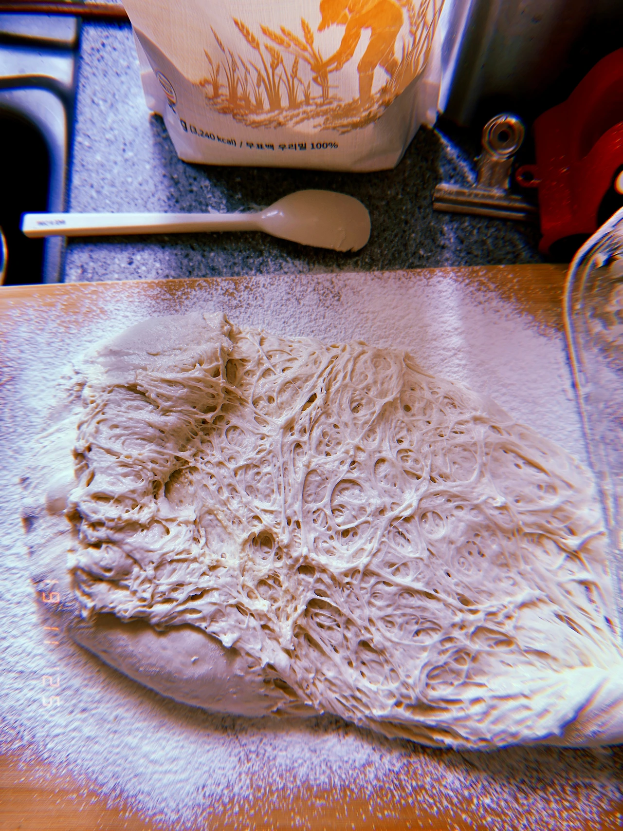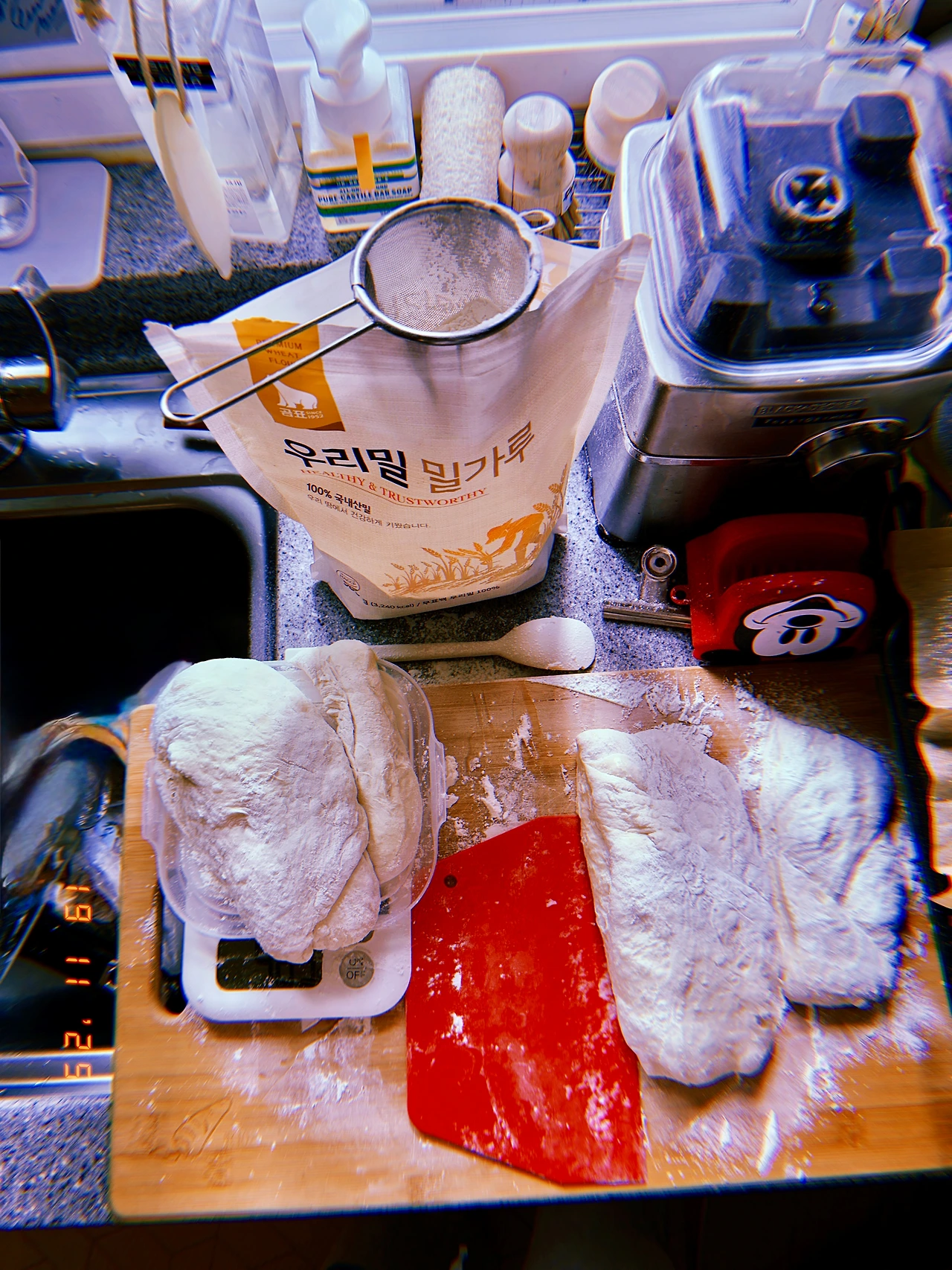 Beautiful 발효. 초토화된 키친. 심혈을 기울인 <바게트 틀 역할 종이>에 국 데우다 불붙어서@@! (차마 사진은 못 찍었다=기록과 글에 목숨거는 트위타리안 정신 부족했다.) 겁났지만 얼른 끄고 다시 만듦.--' 오븐에 반죽 넣고 <고기 뭇국에 누룽지 끓여서+김치> 먹으며 기다리는 중(요가하는 상상중...) #sunny-1 #W19Nov2025