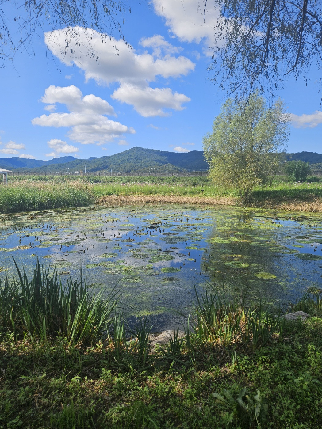 아들과 함께 집 근처 탄천으로 수서곤충을 잡으러 갔다. 햇살은 투명했고, 구름은 게으른 새처럼 느릿하게 흘렀다. 물결 위로 부서지는 빛이 반짝이며 연못을 감싸고 있었다. 그 풍경은 마치 모네의 수련 속 한 장면처럼 현실과 꿈의 경계 위에 떠 있었다. 연못 가장자리에 개구리밥이 초록의 점처럼 흩어져 있었고, 수련은 붉은 기가 도는 잎을 조용히 펼쳐 늦가을의 햇살을 품었다.