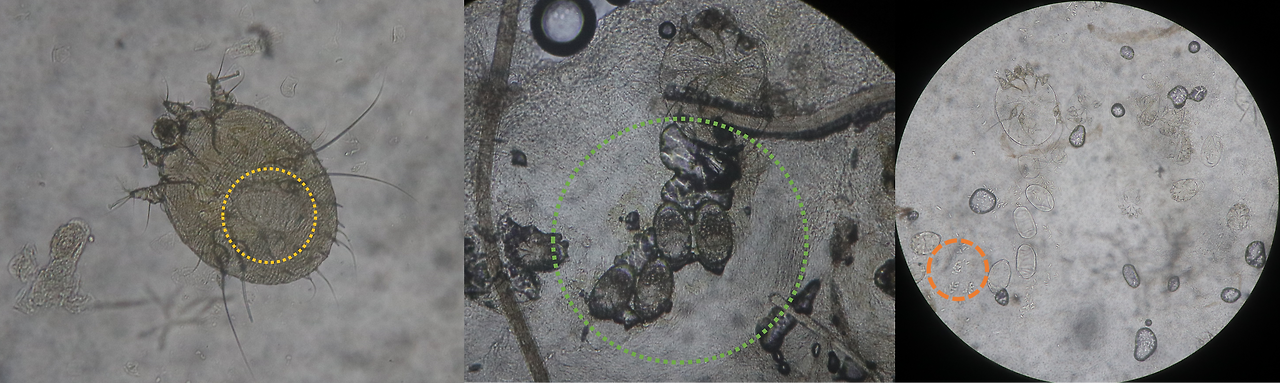 옴은 왼쪽처럼 동그란 로봇청소기같이 생겼고 크기는 0.2-0.4mm 정도 되는 진드기 목의 곤충이다.