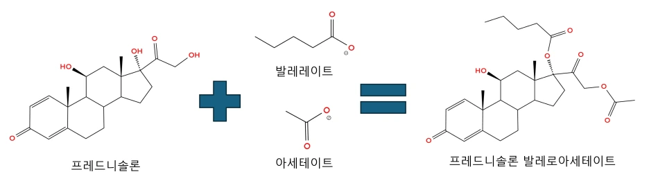 발레레이트(Valerate): 긴 탄소 사슬로, 약물이 기름에 잘 녹게(지용성) 만들어 피부 장벽을 쉽게 통과하도록 돕는다.