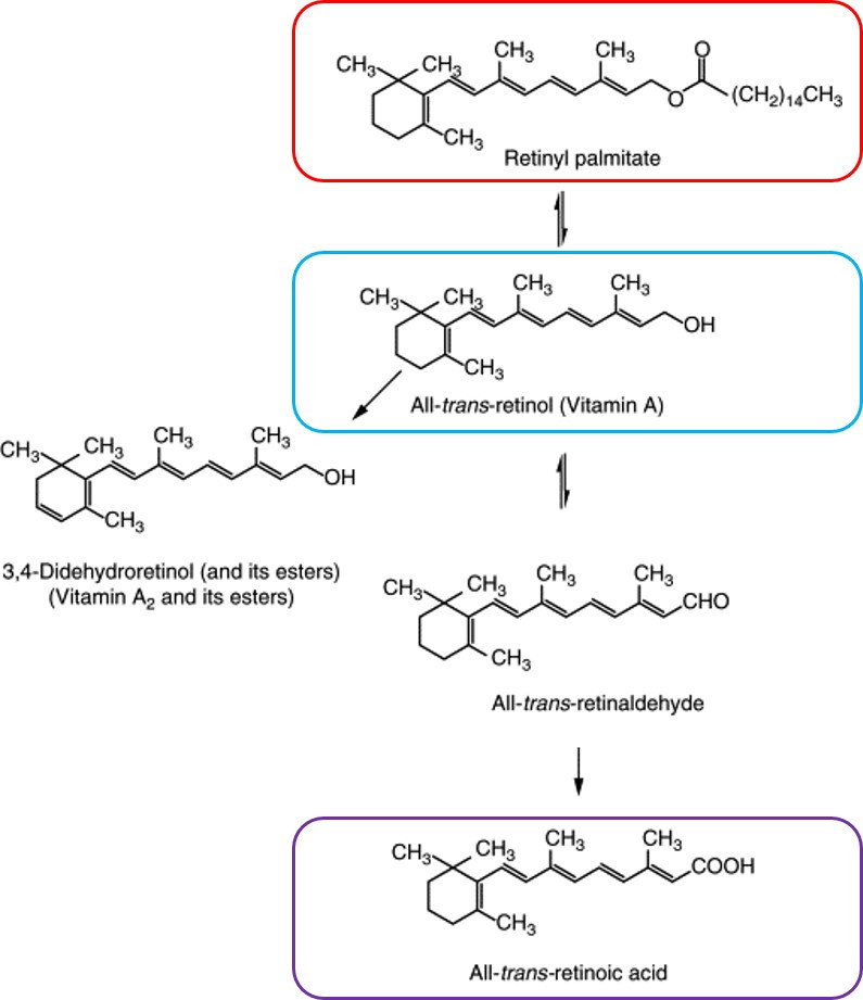 그림을 보시면 레티놀은 레티닐 팔미테이트가 되거나 레티날데하이드를 거쳐 레티노산이 되거나 비타민 A2 또는 그것의 에스터 형태로 변환됩니다.