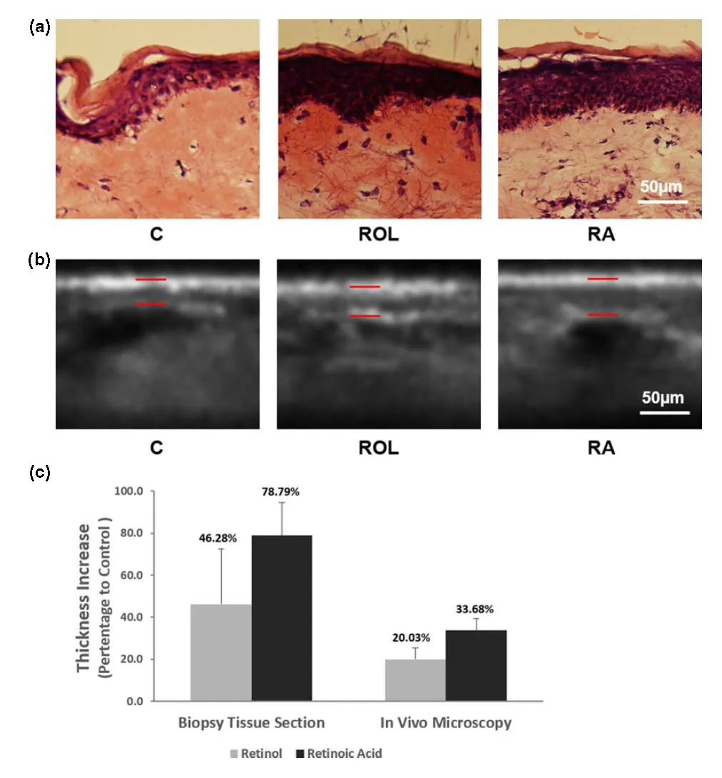 조직 검사한 피부와 팔에서 직접 측정한 결과 모두에서 레티노산 군이 레티놀 군에 비해 더 많이 증가한 결과를 보입니다.