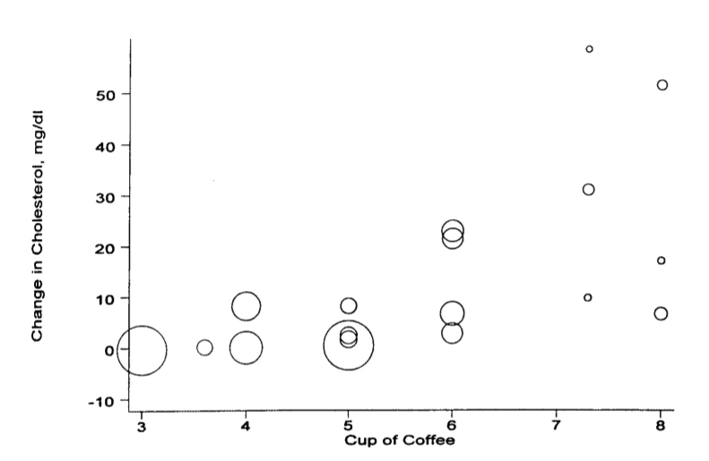 연구별 평균 커피 잔수와 총 콜레스테롤 양을 그래프로 나타낸 것으로 섭취량과 콜레스테롤 양이 비례하는 결과를 볼 수 있습니다.