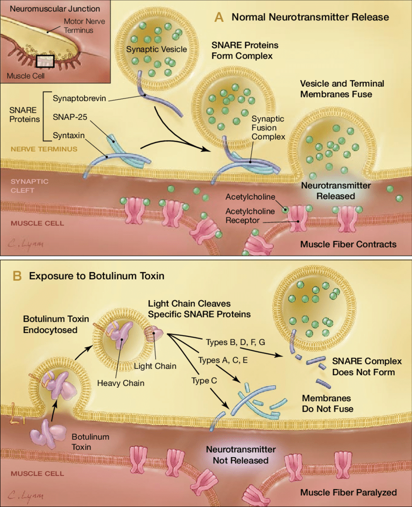 (A 그림처럼 아세틸콜린이라는 신경전달물질이 분비가 돼야 하는데 보톡스를 주입하면 B그림처럼 보톡스가 신경 말단부로 들어가서 아세틸콜린이 분비되는 것을 여러 기전을 통해서 막아 신경전도가 차단된다.)
