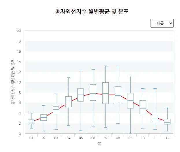 기상청에서 제공하는 지역별 월별 평균 자외선 지수 표이다. 서울을 기준으로 확실히 6,7,8월에 자외선 지수가 가장 높고 9월부터 천천히 낮아지다가 12월과 1월에 가장 낮아지는 것을 볼 수 있다.