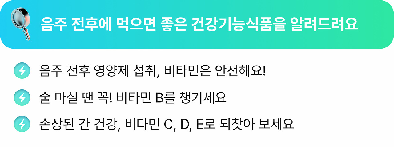 그럼 음주 전후에 영양제를 먹어도 될까요? 정답부터 말씀드리자면, 1)간이 해독하기 어렵거나 2)술의 알코올과 상호작용을 하는 성분만 아니라면 드셔도 된답니다! 이전에 말씀드렸듯, 건강기능식품은 의약품이 아니기 때문이에요.