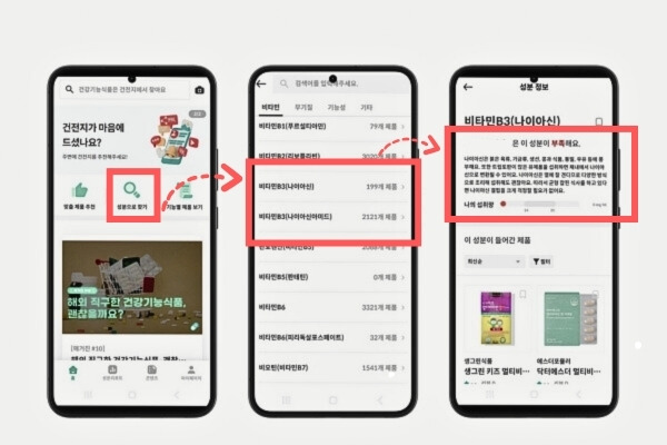 건전지 앱은 시중에 판매 중인 비타민 B3 제품들을 나이아신과 나이아신아미드의 함유 여부에 따라 미리 분류해 두었어요. 홈 화면-성분으로 찾기-비타민 코너에서 각각의 성분을 함유한 제품을 간편하게 검색해 보세요! 개별 성분 정보 화면에서는 나의 일일 섭취량과 더불어 해당 성분에 대한 설명도 확인하실 수 있답니다.