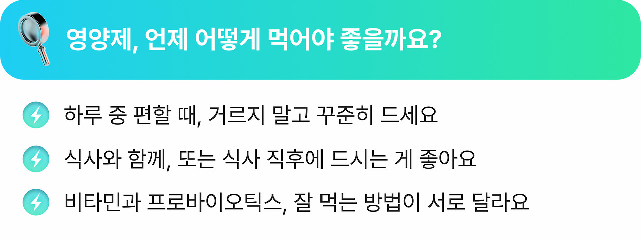 오늘은 영양제를 언제 먹으면 가장 효과가 좋을지 알아봤어요. 요약하자면 1)본인에게 편한 시간대에 2)지방이 함유된 식사 또는 3)충분한 양의 물과 함께 4)꾸준히 복용하시는 게 바로 최고의 건강기능식품 사용법이랍니다. 참 쉽죠?