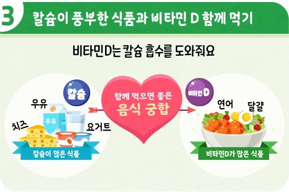 반대로 함께 먹을 때 더 큰 효과를 발휘하는 영양소 조합도 있어요. 비타민 D는 칼슘 흡수를 도와줍니다. 그래서 칼슘과 비타민 D는 함께 섭취하시는 게 좋아요.