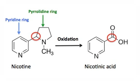 그런데 니코틴과 니코틴산은 전혀 달라요. 비록 니코틴을 산화(Oxidation)시켜서 니코틴산을 얻을 수 있다지만, 위 그림에서 보듯 두 물질의 화학 구조는 서로 완전히 다르답니다. 물론 성질도 전혀 딴판이죠! 니코틴은 담배 속에 들어있는 유독물질이지만, 니코틴산은 건강에 도움을 줄 수 있는 유익한 물질이에요.