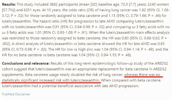 사실 2009년에 발표된 다른 논문에 루테인이 폐암 발생 위험을 2 배 정도 높였다는 결과가 있기는 해요[9]. 즉 식약처가 논문을 잘못 인용한 것이죠.