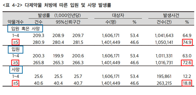 건강보험공단의 2019년 연구에 의하면, 한국의 노인 환자 중 90일 이상 다제약물을 사용한 환자는 2019년 기준 전체의 41.8%나 되고, 초다제약물사용(hyperpolypharmacy, 동시에 10개 이상 약물 사용)자 비율도 10.4%에 달해요[1].