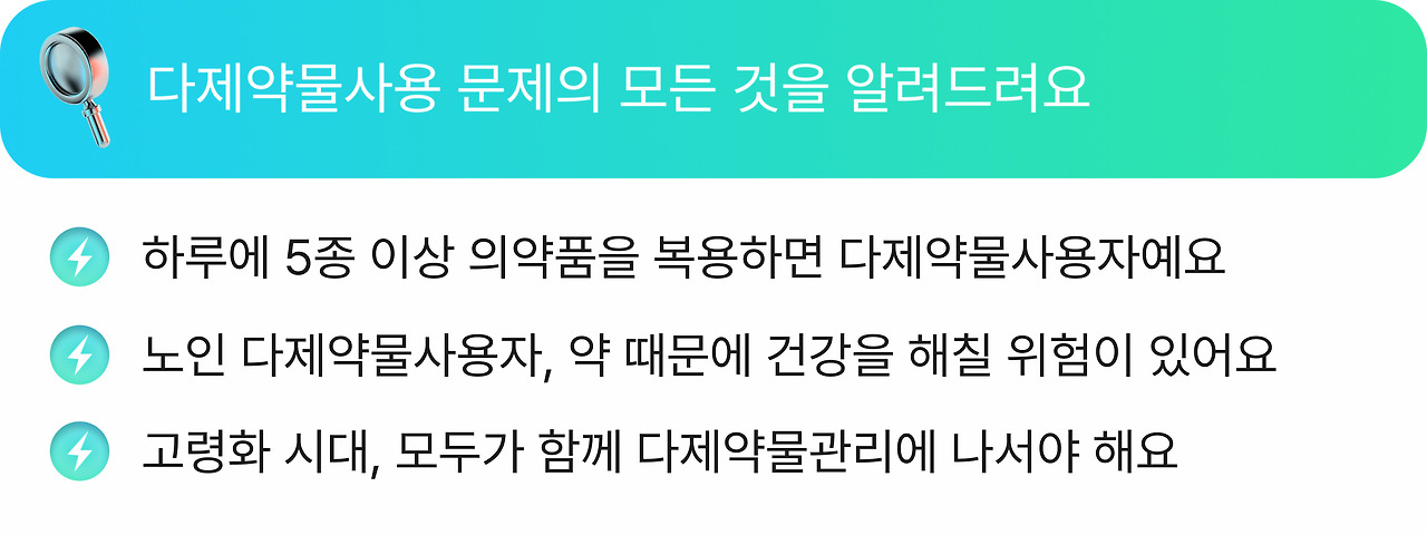 한국은 세계에서 가장 빠르게 고령화 사회로 진입 중인 나라예요. 이런 상황에서 노인 다제약물사용 문제는 국가적으로 매우 중요한 과제라고 할 수 있습니다. 이 문제를 해결하려면 정부와 보건의료계, 일반 시민 모두가 함께 뭉쳐 해결책을 찾아야 해요. 더불어 환자 개개인이 먼저 다제약물 문제를 인지하고 주도적으로 의료 전문가에게 도움을 요청하고 나설 때, 비로소 정확한 해결의 실마리를 찾을 수 있을 거예요.