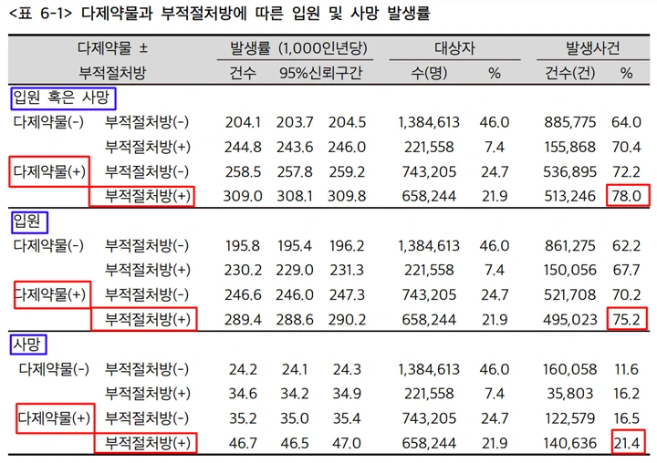 이렇게 잘못된 처방은 노인 환자의 정신적, 신체적 기능을 떨어뜨리고 약물유해반응(adverse drug reaction)의 위험을 높여요. 위의 표에서 보듯, 다제약물 처방과 부적절처방이 모두 존재한 경우에는 그렇지 않은 경우나 하나만 존재한 경우보다 입원률과 사망률이 실제로 높게 나타났답니다.