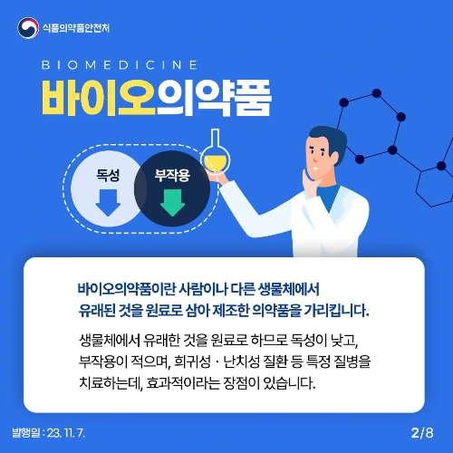 바이오의약품은 사람 또는 다른 생물체에서 유래한 원료를 사용해 제조한 의약품이에요. 우리가 흔히 사용하는 알약, 캡슐, 연고 같은 기존 의약품은 통상 화학적인 합성 공정을 통해 제조되기 때문에 ‘합성의약품(Synthetic drugs)’이라 불려요. 이 합성의약품이 불특정 다수의 사람에게서 공통된 효과를 발휘하는 것과 달리, 세포나 항체 같은 생체 원료를 이용하는 바이오의약품은 맞춤형으로 설계가 가능해 그동안 치료가 어려웠던 희귀•난치성 질환 분야에서 탁월한 성과를 내고 있어요.