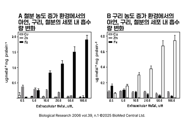 하지만 이 둘을 동시에 섭취하면 나쁜 상호작용이 일어나 서로의 흡수를 방해할 수 있답니다. 아연과 구리는 십이지장에서 흡수 경쟁을 하는 사이이기 때문이에요. 그래서 아연을 많이 먹으면 구리가 잘 흡수되지 않고, 반대로 아연이 적으면 구리가 더 잘 흡수돼요[6]. 이건 아연을 섭취할 때 생성되는 메탈로티오네인(Metallothionein;MT) 이라는 특별한 단백질 때문이랍니다.