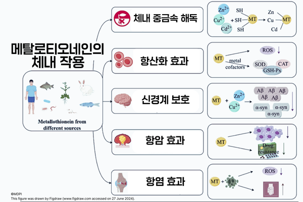주로 간, 신장, 소장에서 발견되는 메탈로티오네인은 카드뮴 같은 중금속과 결합하는 능력이 뛰어나 몸 안의 독성을 효과적으로 제거해요. 또한 강력한 항산화 작용을 통해 산화 스트레스로부터 세포를 보호하고, 항염 작용과 신경조직 보호는 물론 암세포 억제 효과까지 기대할 수 있답니다[8].