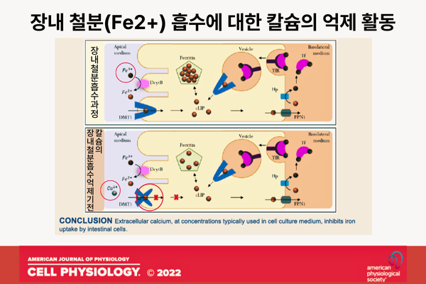 우선 칼슘(Calcium;Ca)과 철분은 체내 흡수 경로가 유사해 서로 흡수 경쟁을 하는 사이입니다. 그래서 철분과 칼슘을 동시에 복용하면 철분의 흡수율이 떨어질 수 있어요.