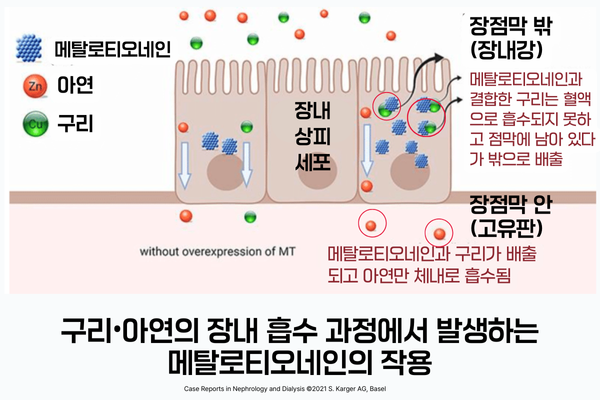 그런데 이 메탈로티오네인은 구리를 아주 좋아해 잘 결합해요. 그래서 구리를 만나면 달라붙어 장 내벽의 점막 장세포에 가두고 혈액으로 흡수되지 못하게 해요. 이렇게 메탈로티오네인에게 붙잡힌 구리는 장 점막에 달라붙어 있다가 몸 밖으로 배출된답니다[10].
