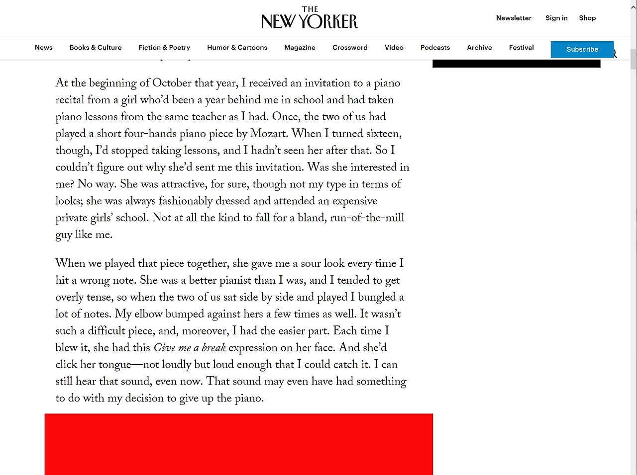 그 시점에 사건의 시작을 알리는 초대장을 하나 받게 되었다. 그해 10월에 피아노 초대장이 난데없이 나에게 날아온 것이다. 나는 적어도 나에게 피아노 초대장을 보낼 사람이 없다는 것쯤은 알고 있었다. 하지만 초대장을 보니 누가 보냈는지 어렴풋하게 기억이 났다. 초대장을 보낸 사람은 피아노를 같이 배웠던 한 학년 후배인 여자애였다. 나의 기억으로 그 여자애와 함께 둘이서 모차르트의 연주곡 ‘네 손을 위한 소나타’를 한 번 쳐 본 적이 있었다. 하지만 나는 16살이 되었을 때 피아노 레슨을 그만두었다. 그 후로 그 여자애를 본 적은 없었다.