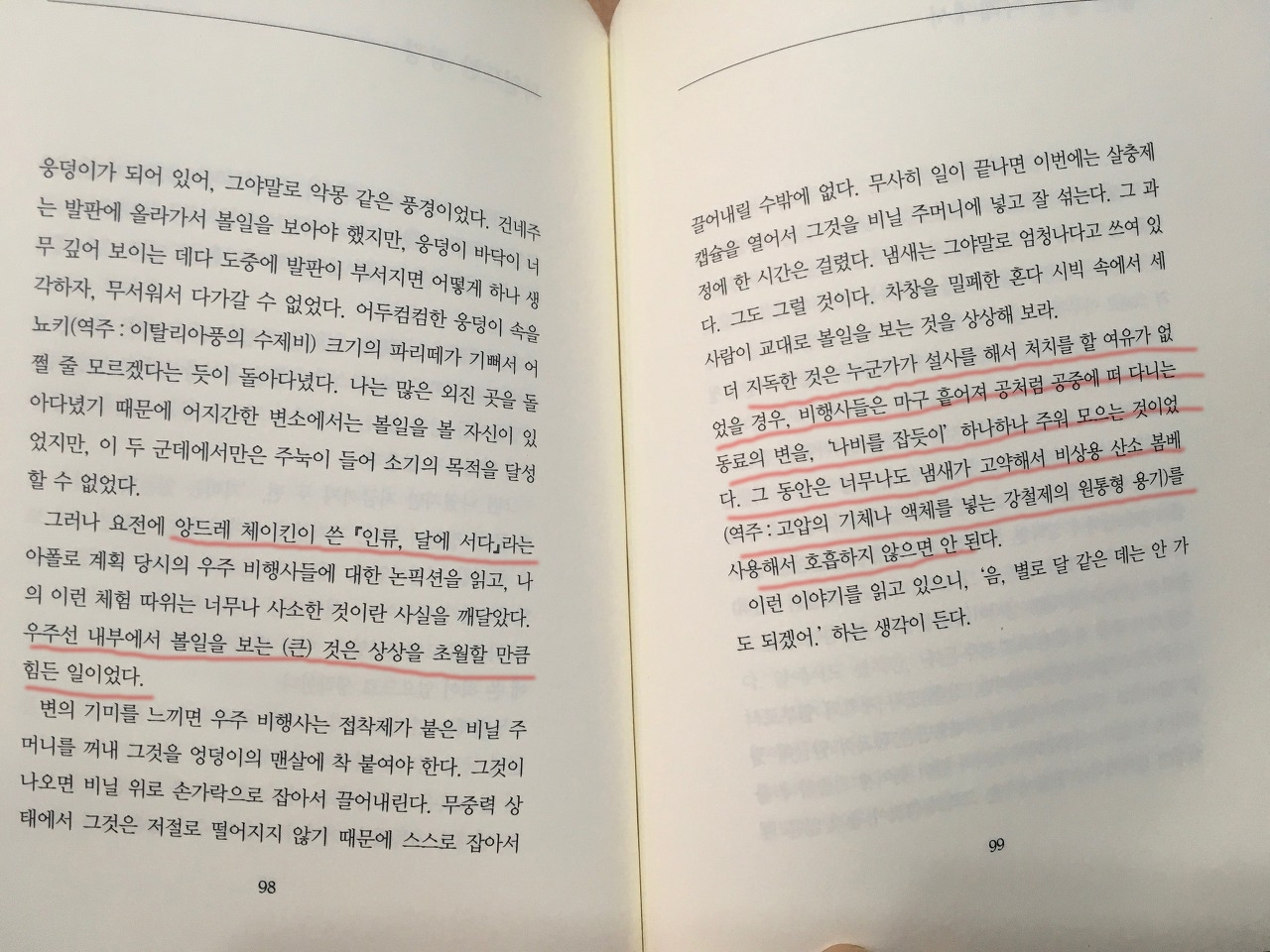우주비행사들이 우주에서 처리하는 대변의 냄새는 엄청나다고 한다. 아마도 그건 먹는 음식이 위에 영향을 줬기 때문일지도 모른다. 뭐 공기의 압력, 밀도, 생체의 리듬, 맥박 같은 것들도 그렇지만 우리가 보통 일반적으로 생활하면서 먹는 음식에서 벗어난 음식을 먹고, 대체로 보통의 생활처럼 대변이 마려울 때마다 시원하게 보는 것이 아니라 참고 참았다가 대변을 보기 때문에 그 냄새가 엄청날 수 있다. 군대 훈련소에 가면 그렇다. 일반적인 식단이 아니다. 기름지고 입맛을 돋우는 면식보다는 탄수화물, 지방, 단백질 섭취에 맞게 식단이 나온다. 그러다 보니 먹고 일주일 정도 있다가 대변이 나오는데 화장실에 들어가지도 못 할 만큼의 냄새가 가득하다.